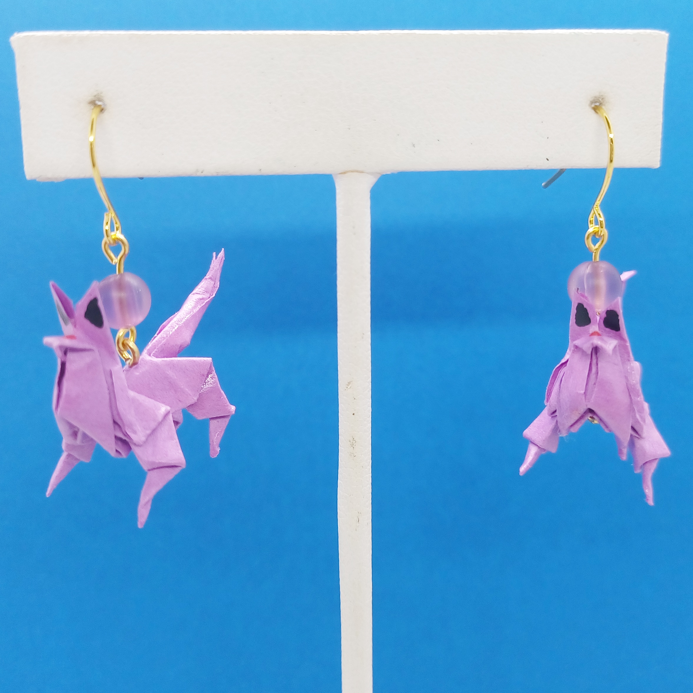 Origami Espeon earrings. Hand-folded and treated with a sealant or varnish to make them more durable and water resistant.