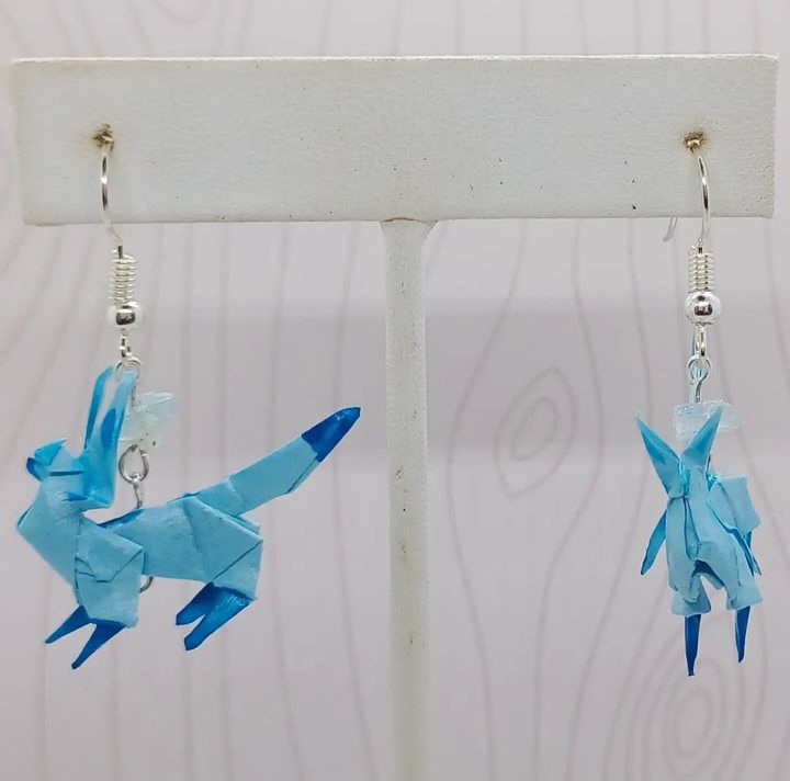 Origami Glaceon earrings. Hand-folded and treated with a sealant or varnish to make them more durable and water resistant.