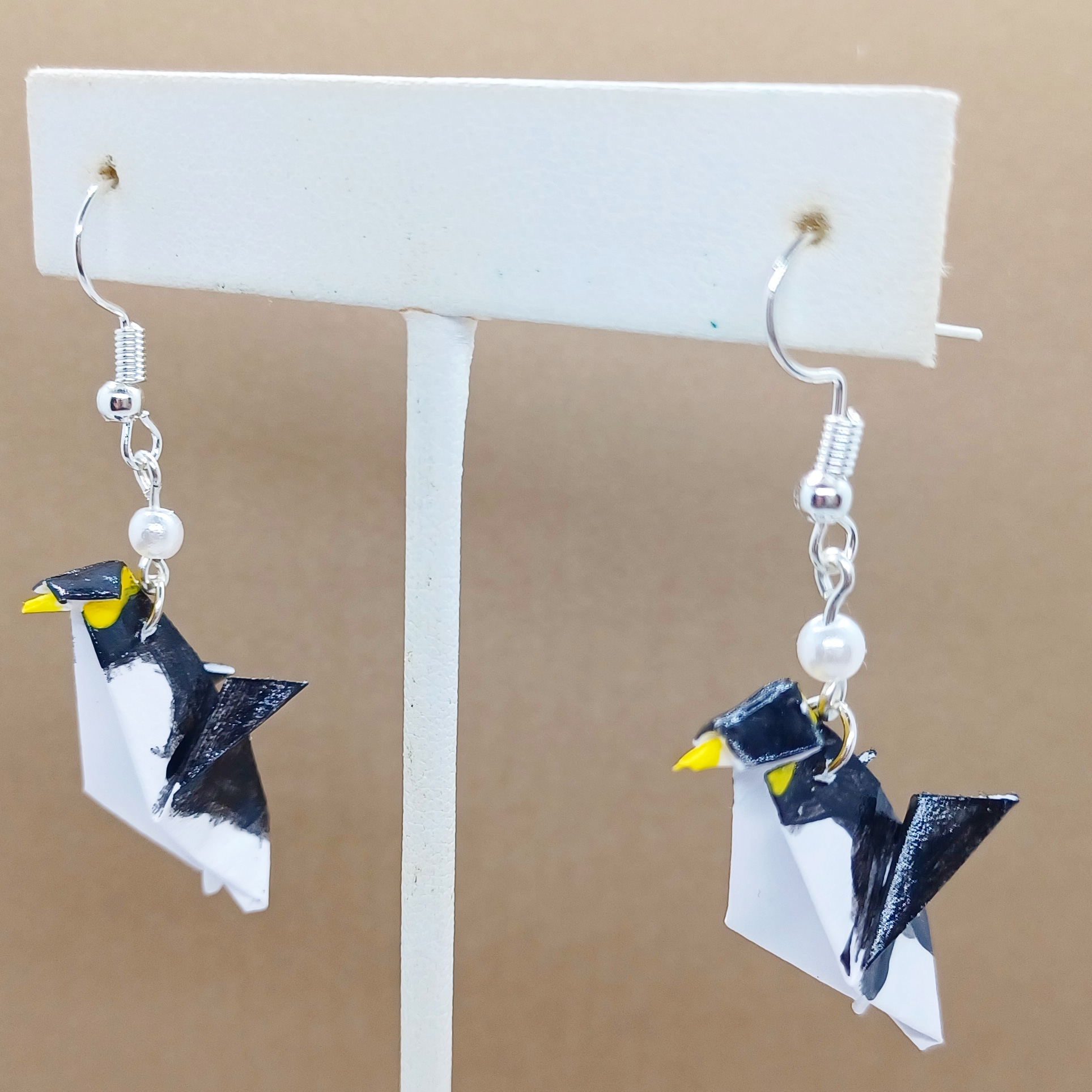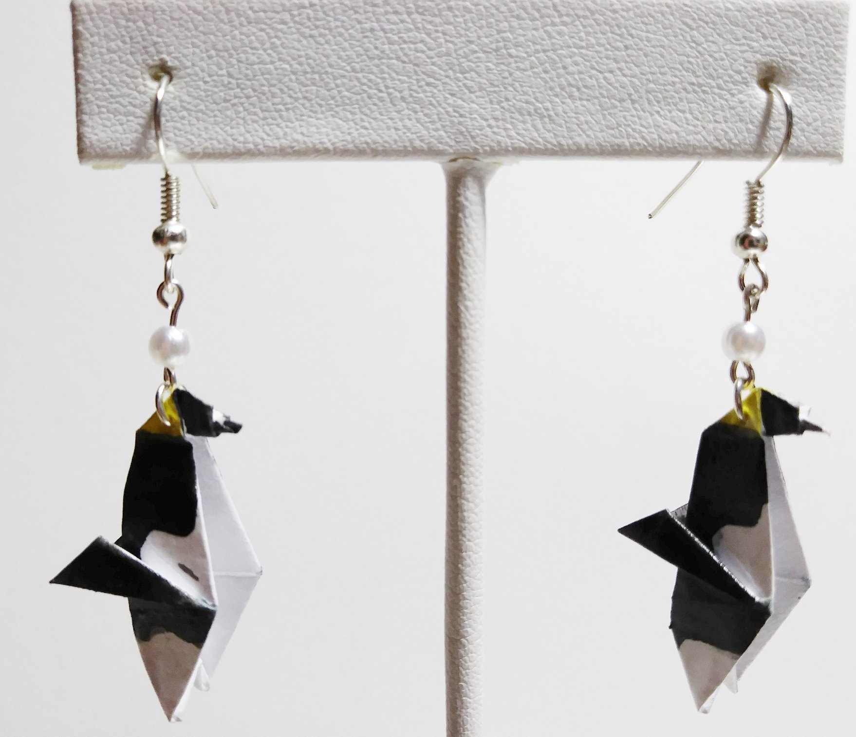 Origami Penguin earrings. Hand-folded and treated with a sealant or varnish to make them more durable and water resistant.