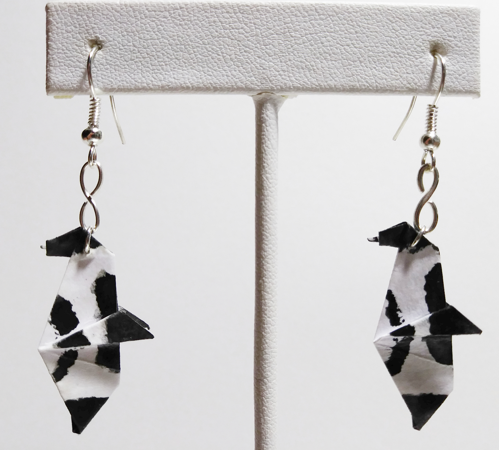 Origami Penguin earrings. Hand-folded and treated with a sealant or varnish to make them more durable and water resistant.
