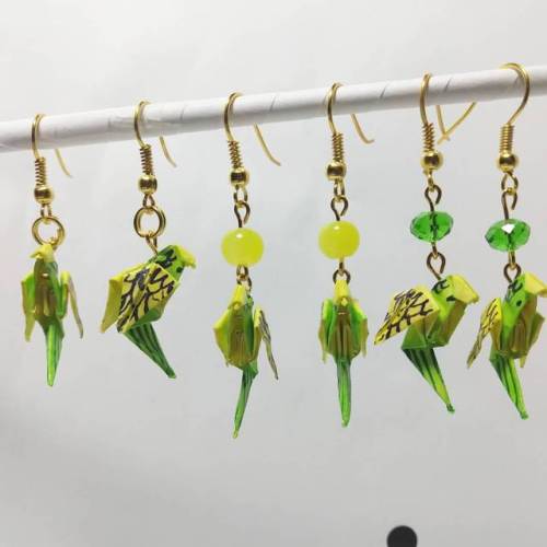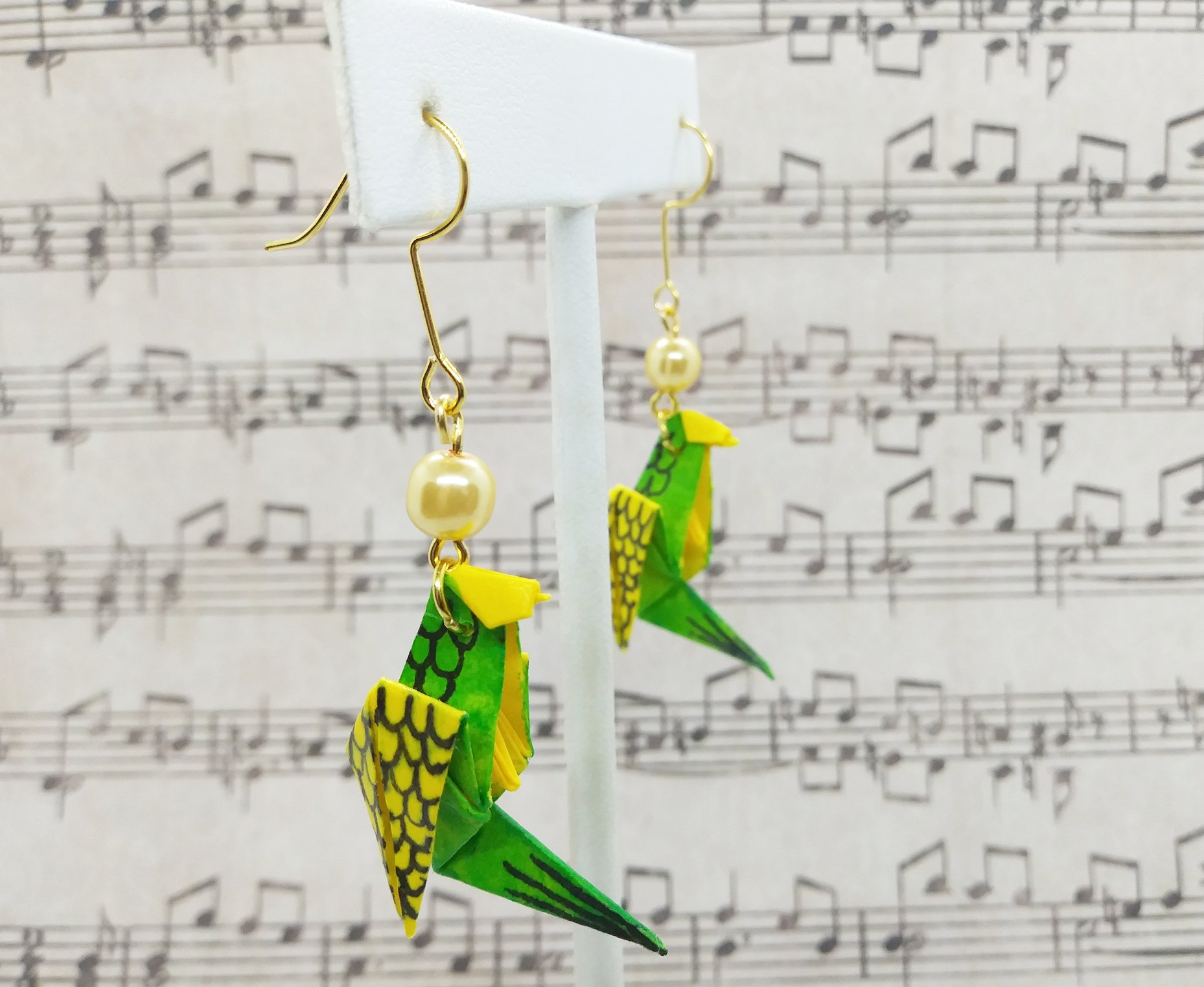 Origami Parakeet earrings. Hand-folded and treated with a sealant or varnish to make them more durable and water resistant.