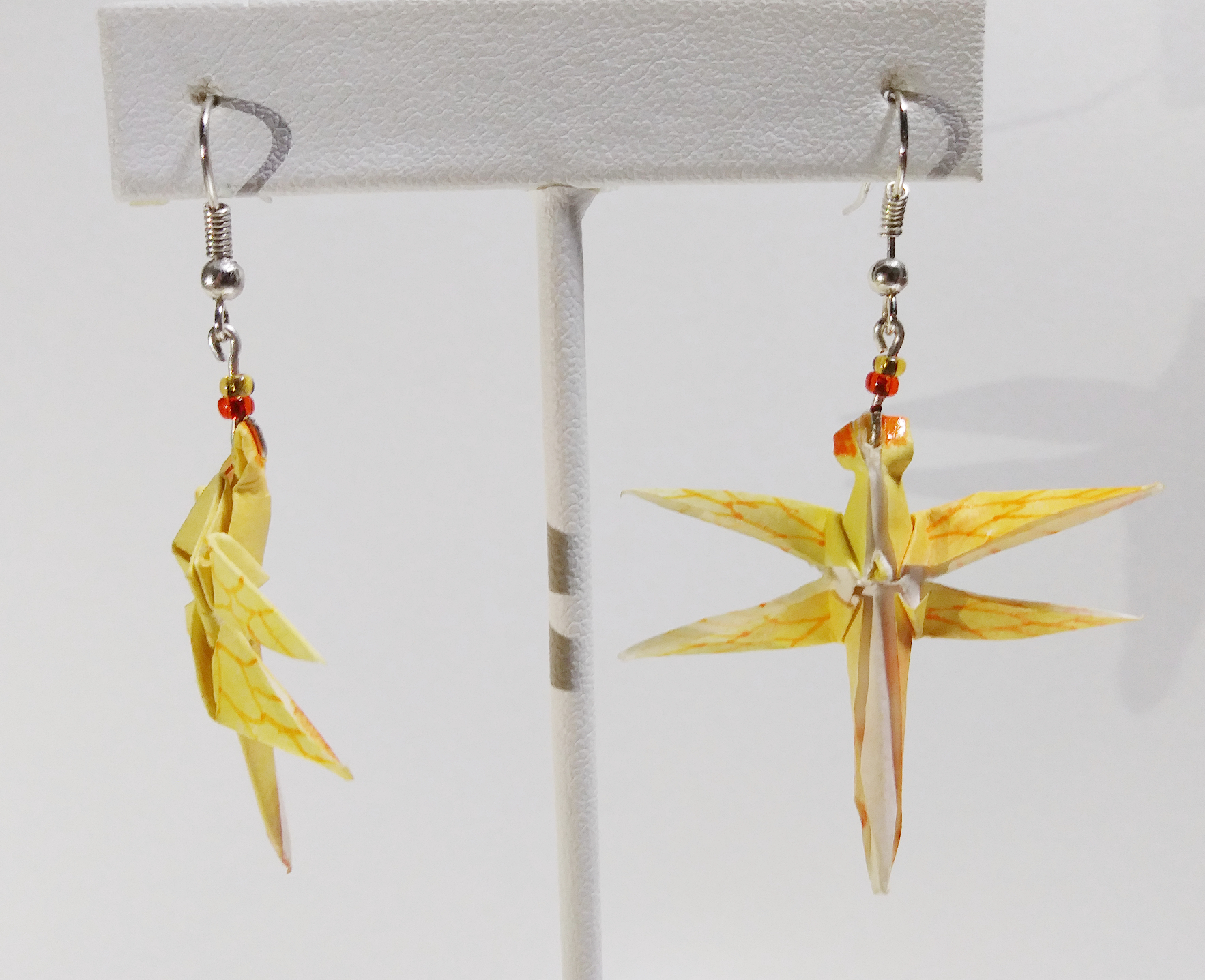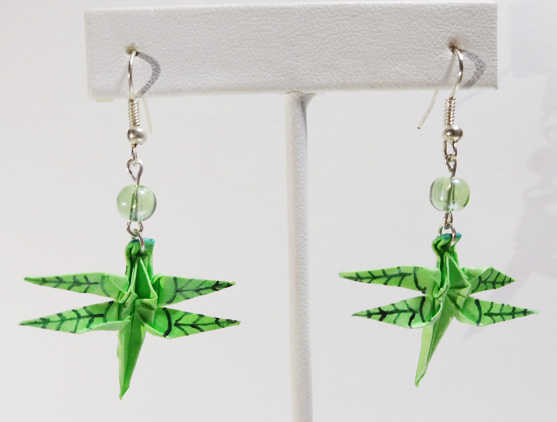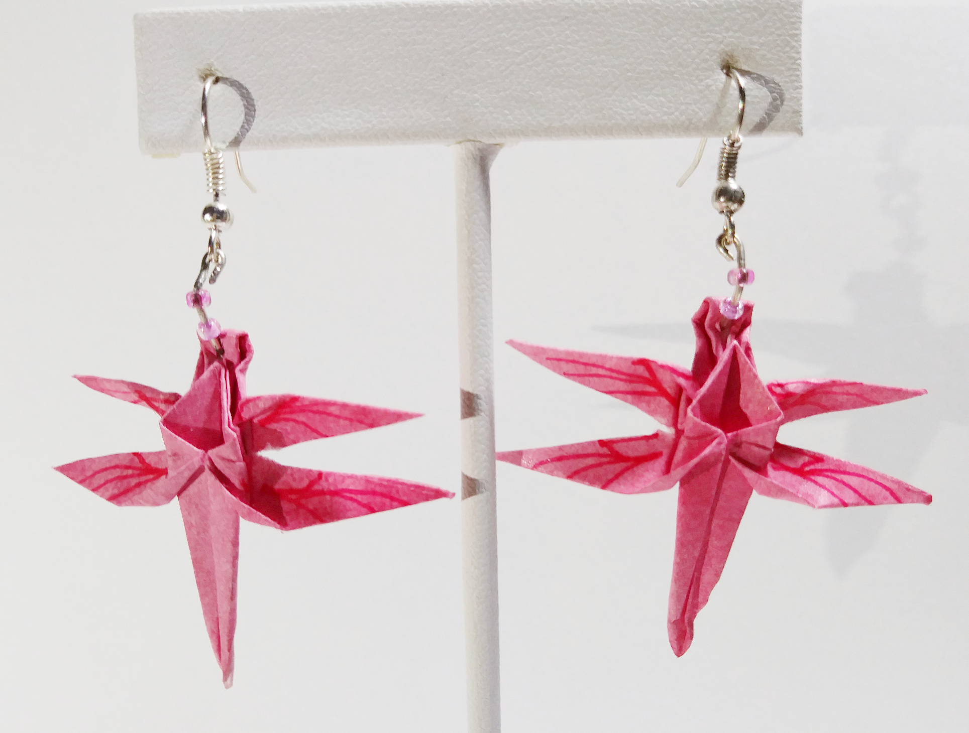 Origami Dragonfly earrings. Hand-folded and treated with a sealant or varnish to make them more durable and water resistant.