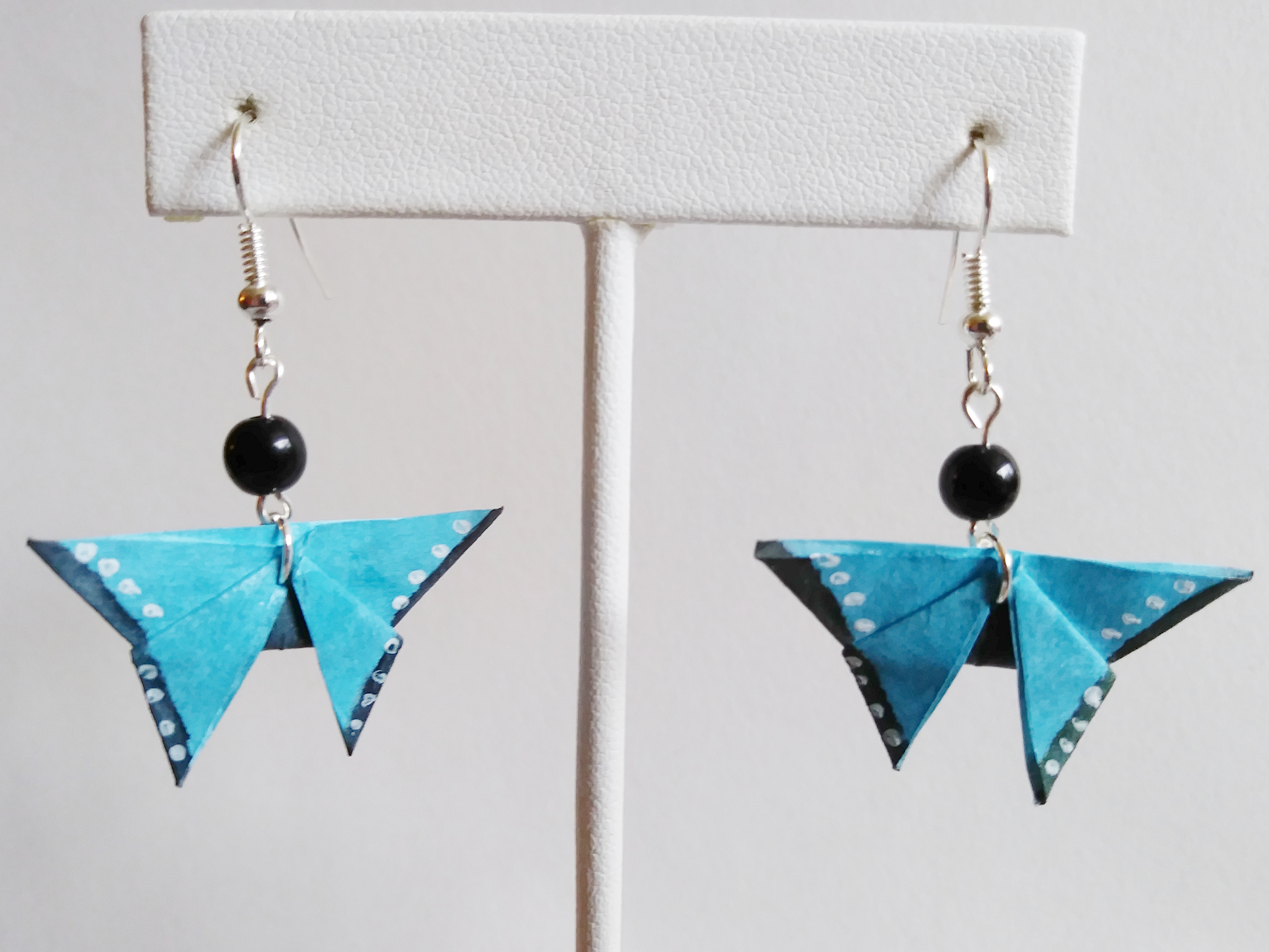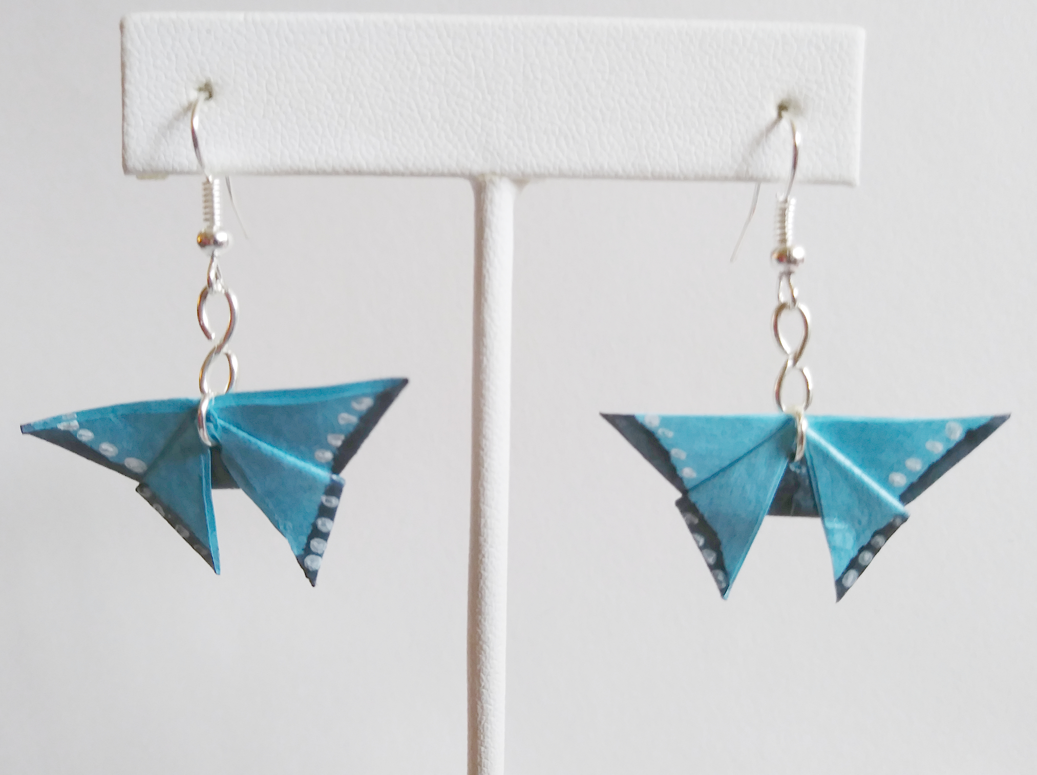 Origami Butterfly earrings. Hand-folded and treated with a sealant or varnish to make them more durable and water resistant.