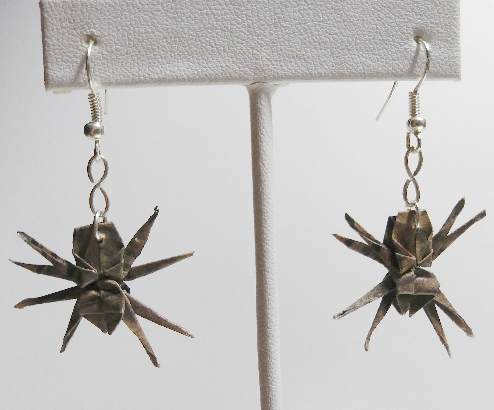 Origami Spider earrings. Hand-folded and treated with a sealant or varnish to make them more durable and water resistant.