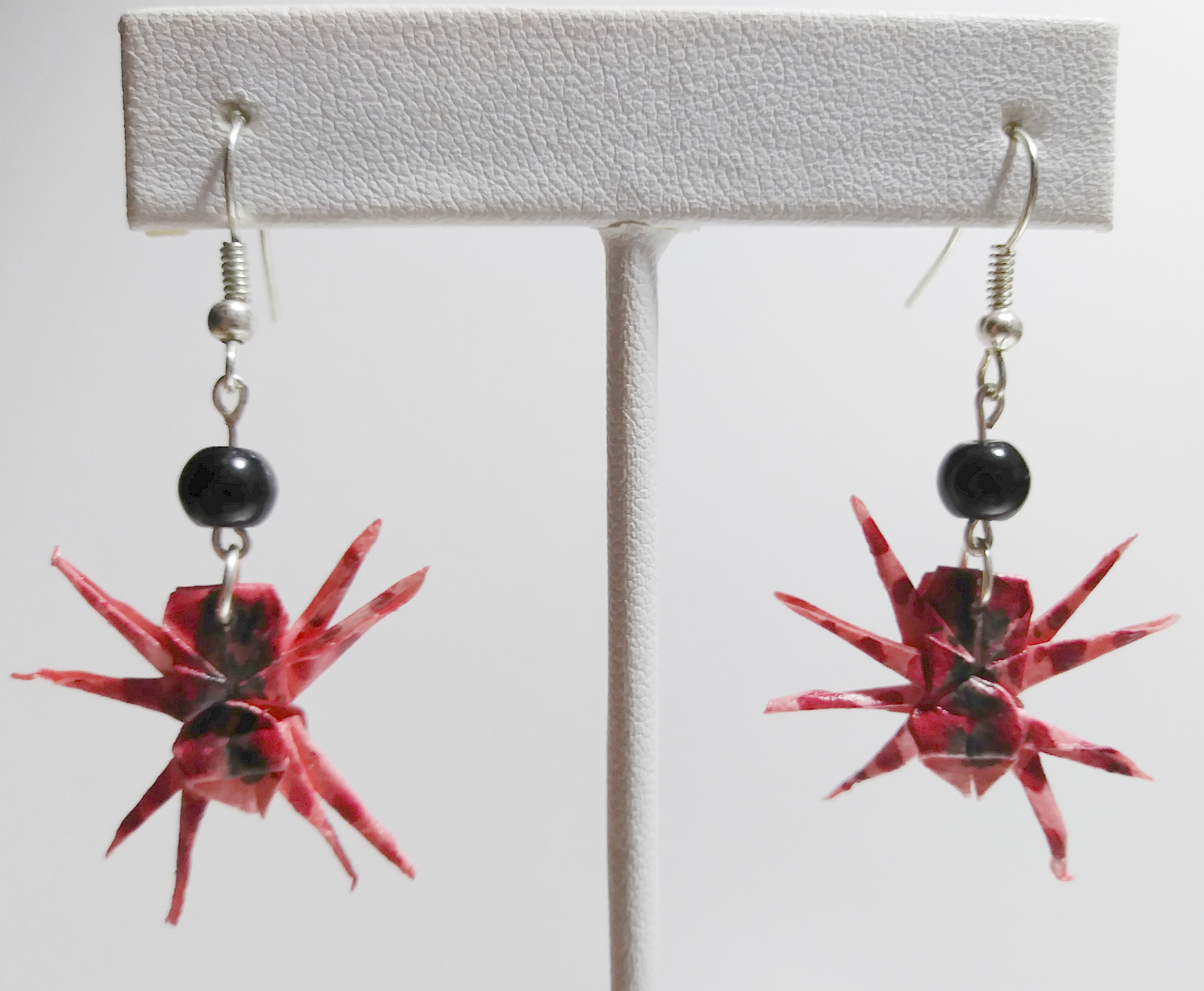 Origami Spider earrings. Hand-folded and treated with a sealant or varnish to make them more durable and water resistant.