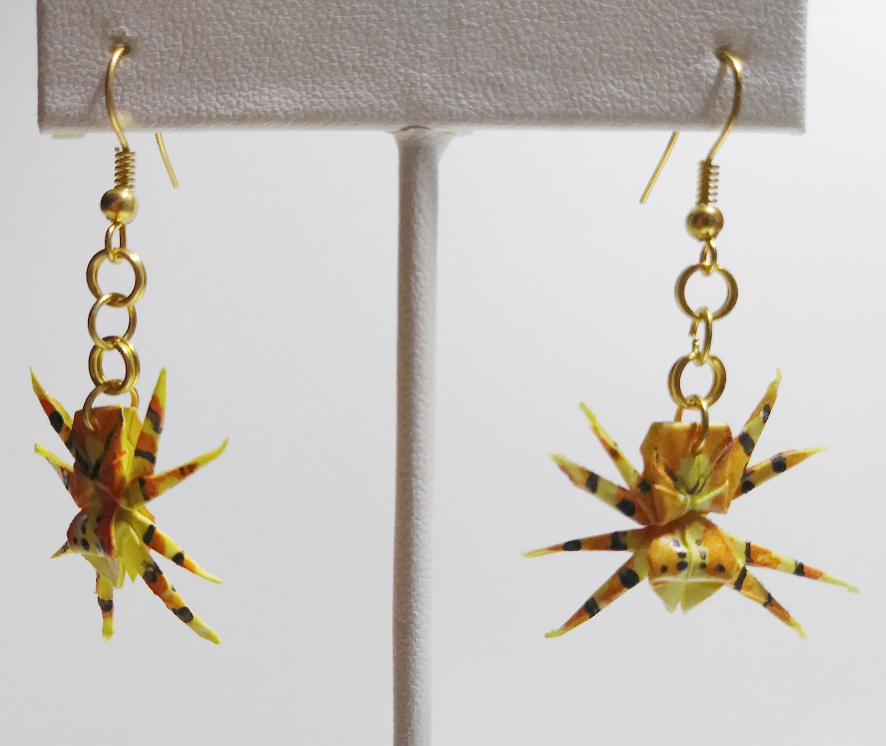 Origami Spider earrings. Hand-folded and treated with a sealant or varnish to make them more durable and water resistant.