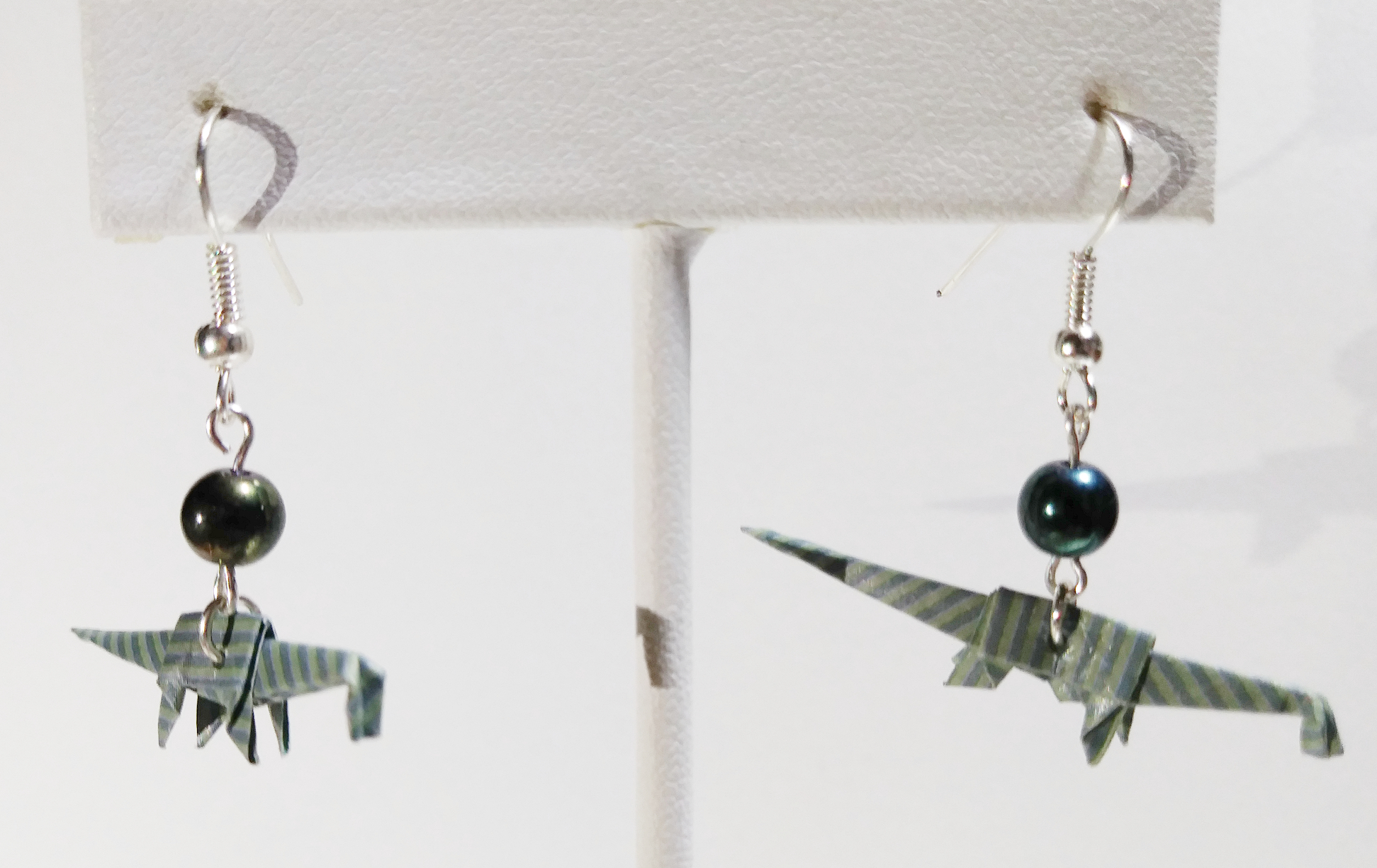 Origami Long Neck Dino earrings. Hand-folded and treated with a sealant or varnish to make them more durable and water resistant.
