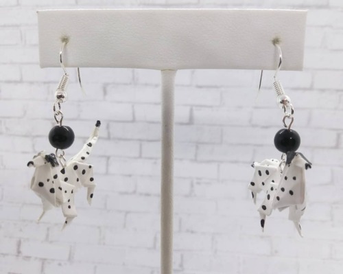Origami Dalmatian earrings. Hand-folded and treated with a sealant or varnish to make them more durable and water resistant.