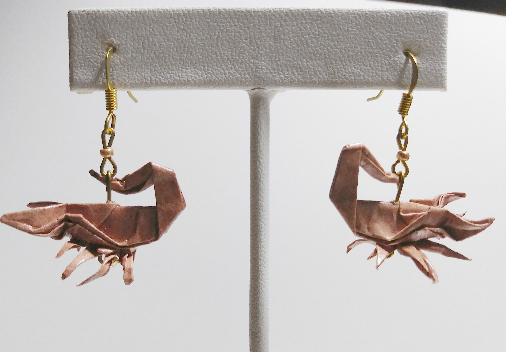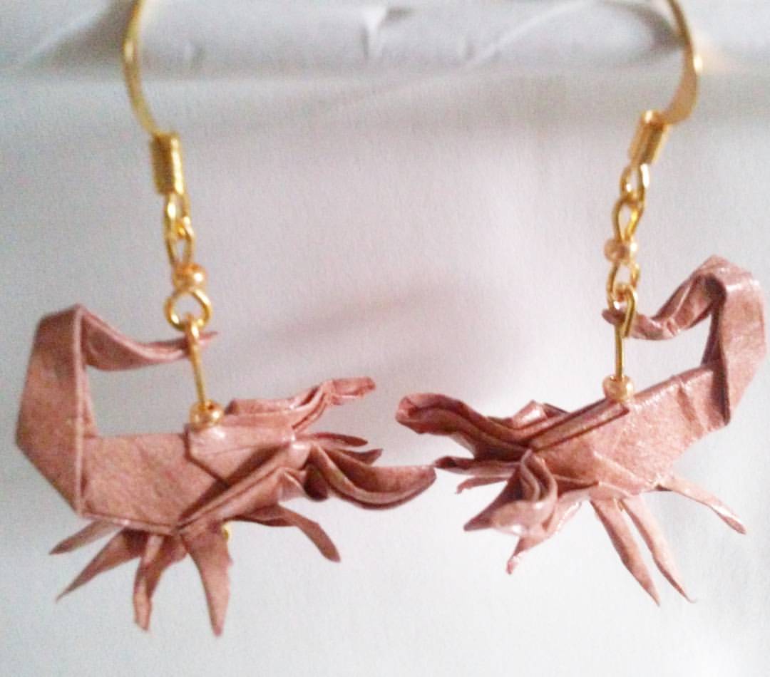 Origami Scorpion earrings. Hand-folded and treated with a sealant or varnish to make them more durable and water resistant.
