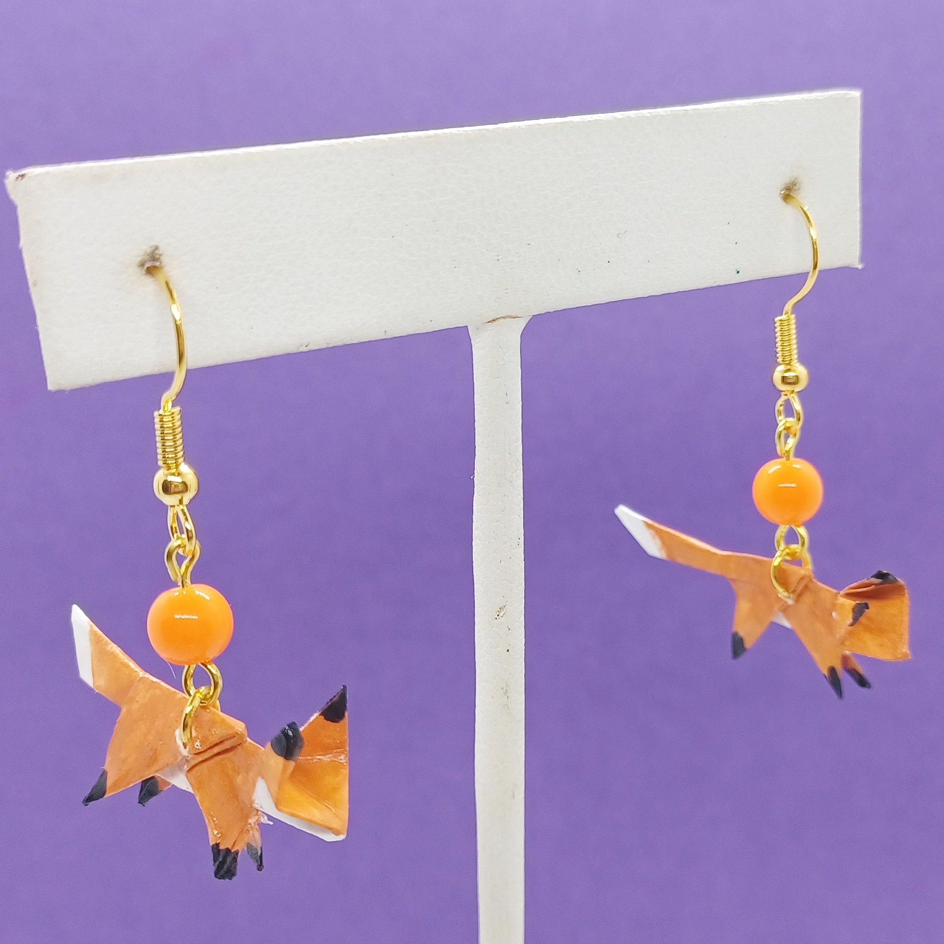 Origami Fox earrings. Hand-folded and treated with a sealant or varnish to make them more durable and water resistant.
