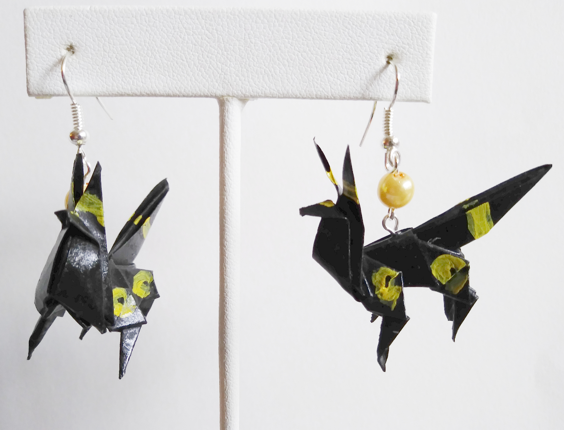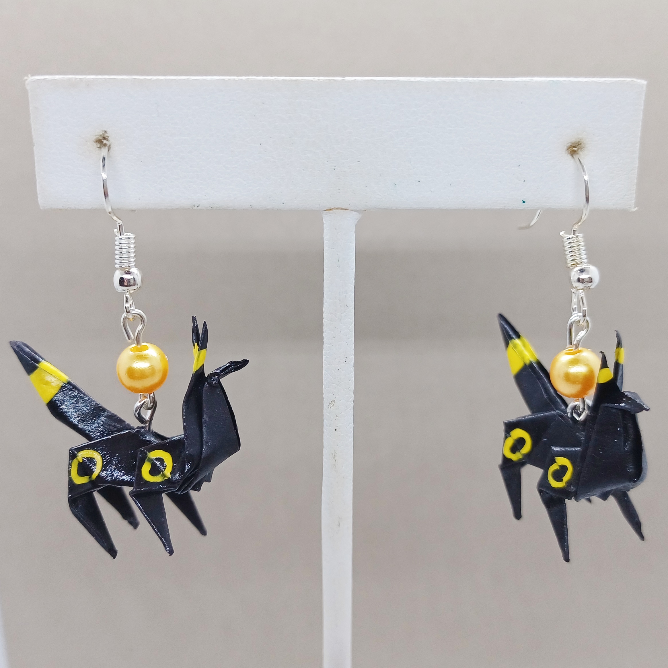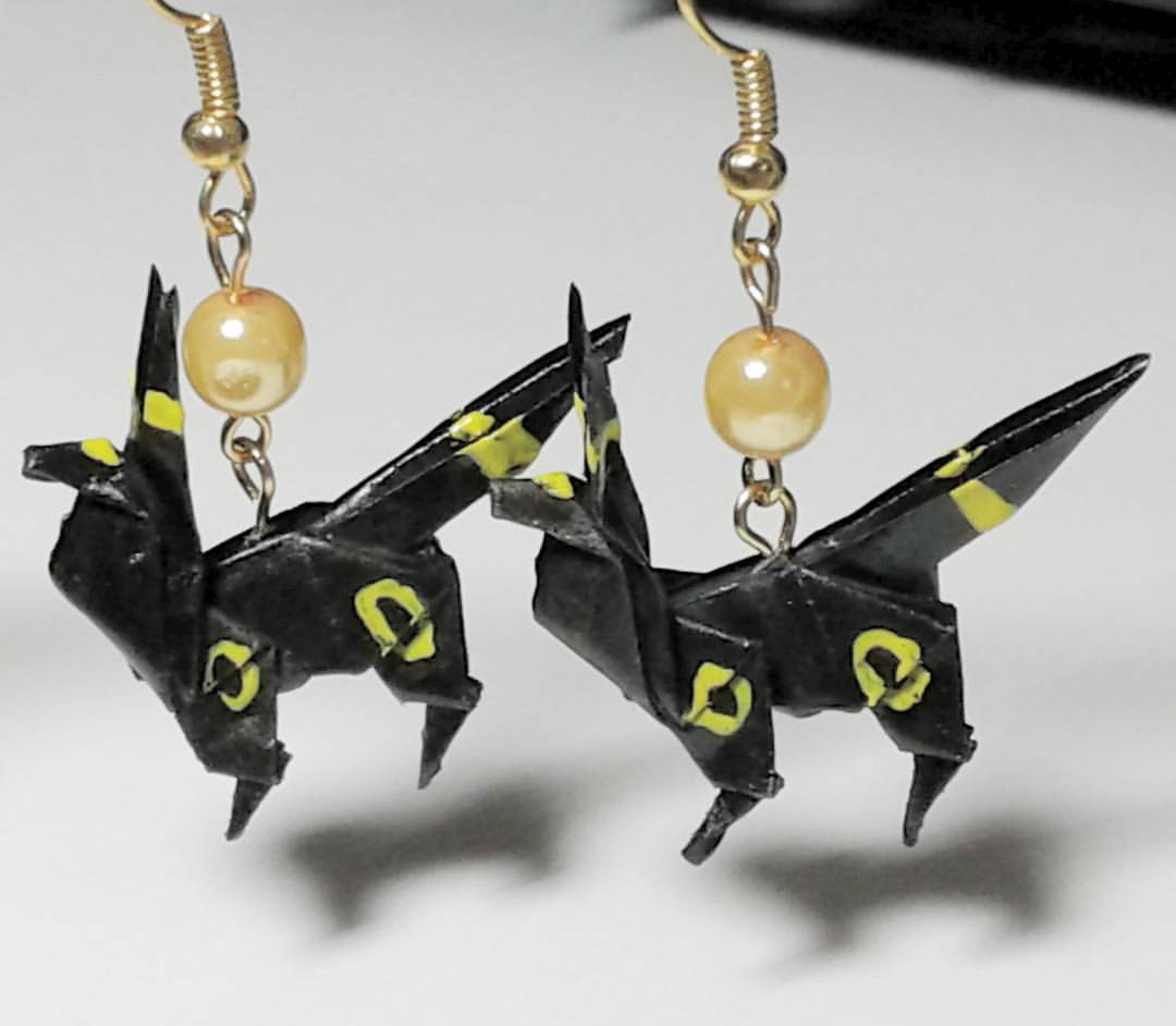 Origami Umbreon earrings. Hand-folded and treated with a sealant or varnish to make them more durable and water resistant.