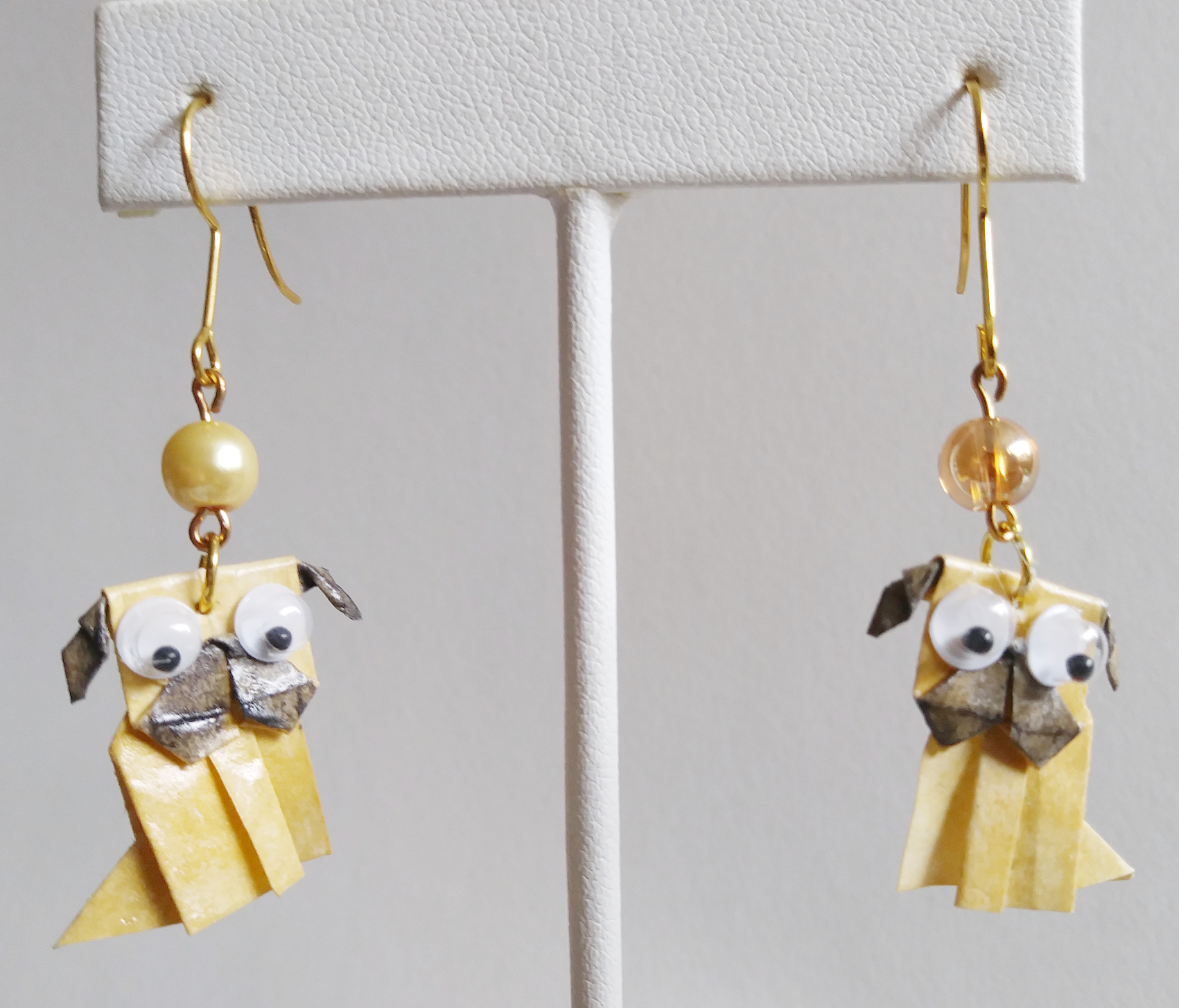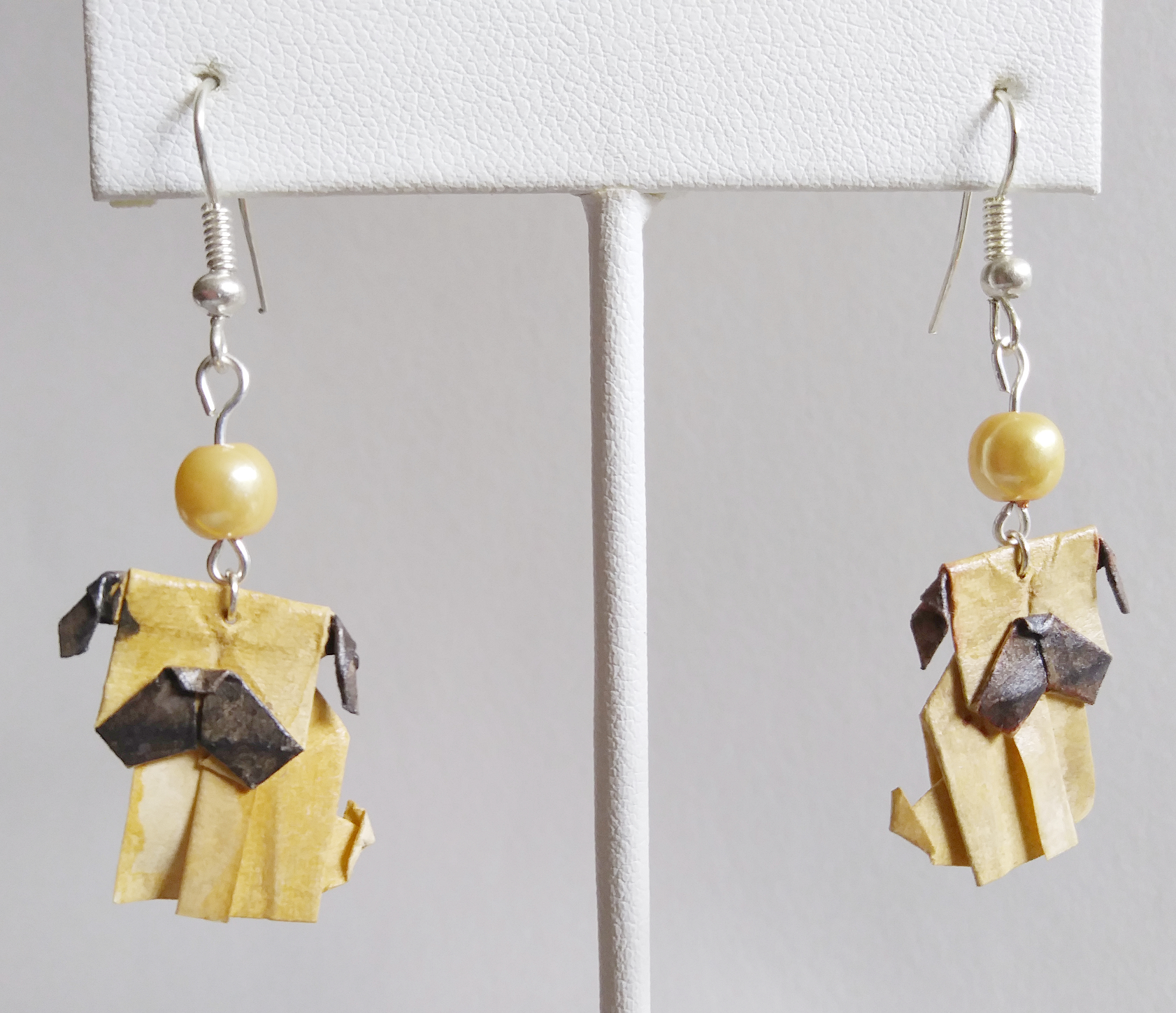 Origami Pug earrings. Hand-folded and treated with a sealant or varnish to make them more durable and water resistant.