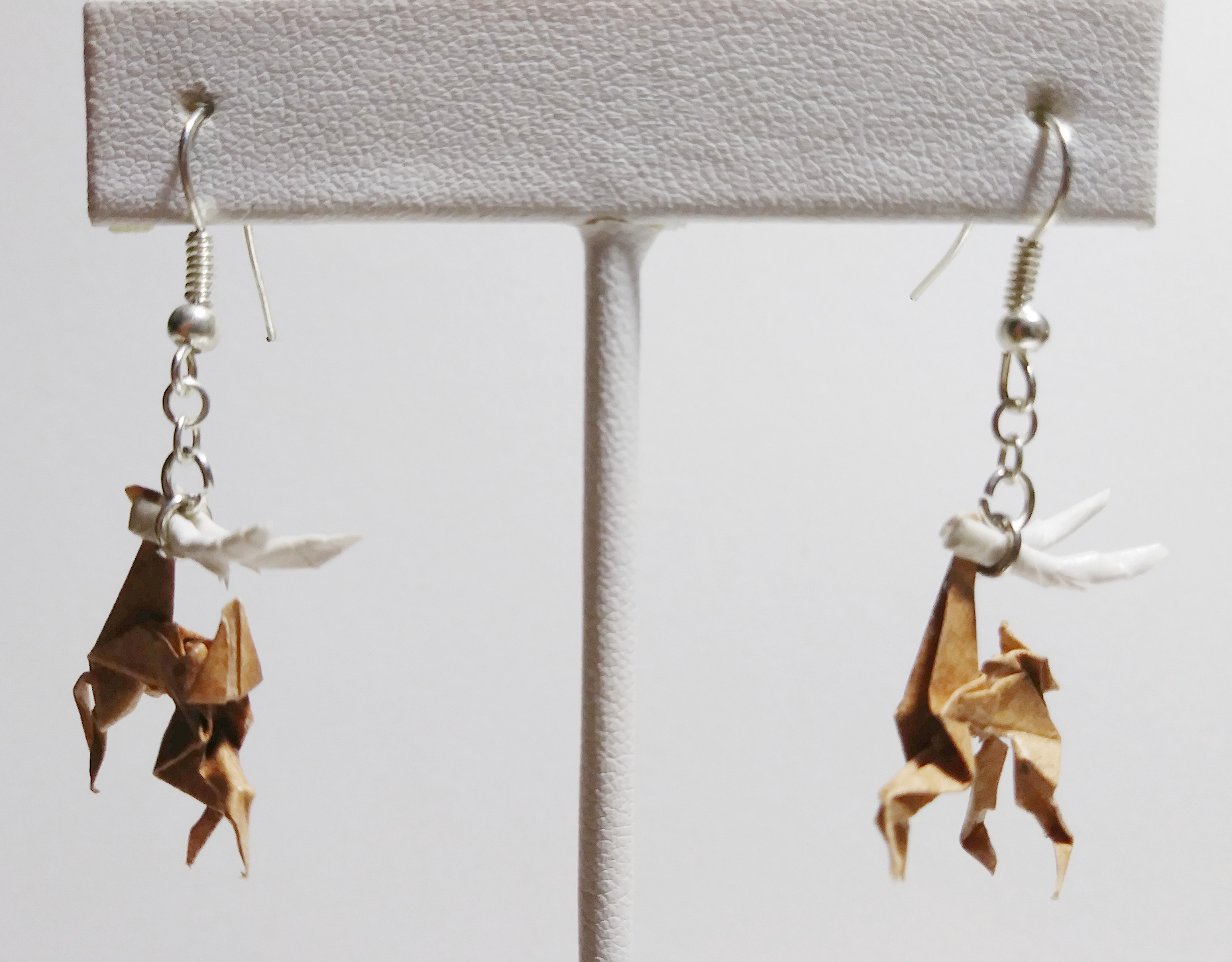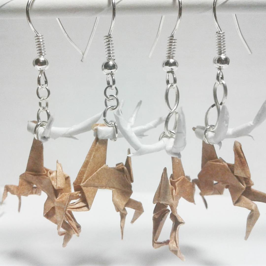 Origami Deer earrings. Hand-folded and treated with a sealant or varnish to make them more durable and water resistant.