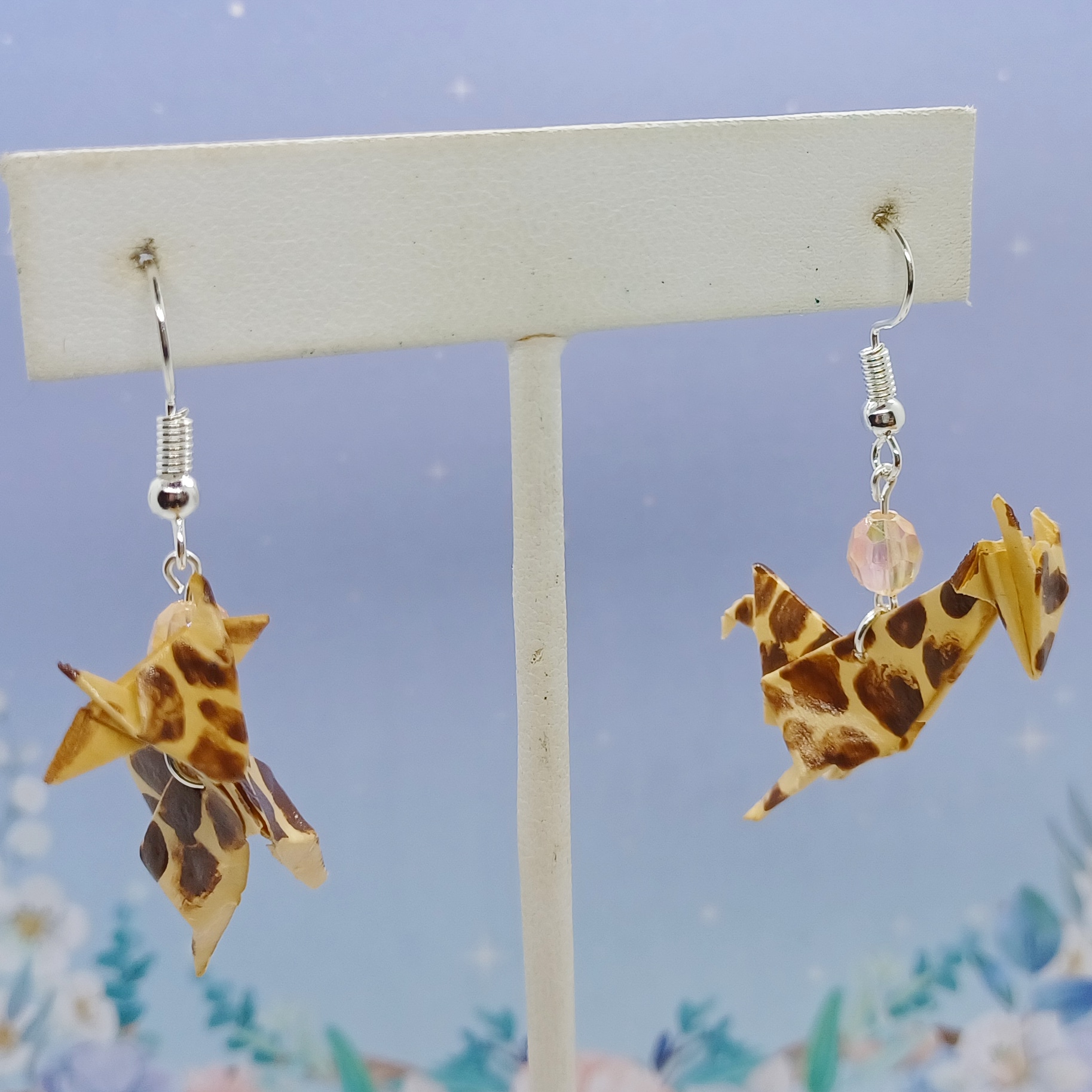 Origami Giraffe earrings. Hand-folded and treated with a sealant or varnish to make them more durable and water resistant.