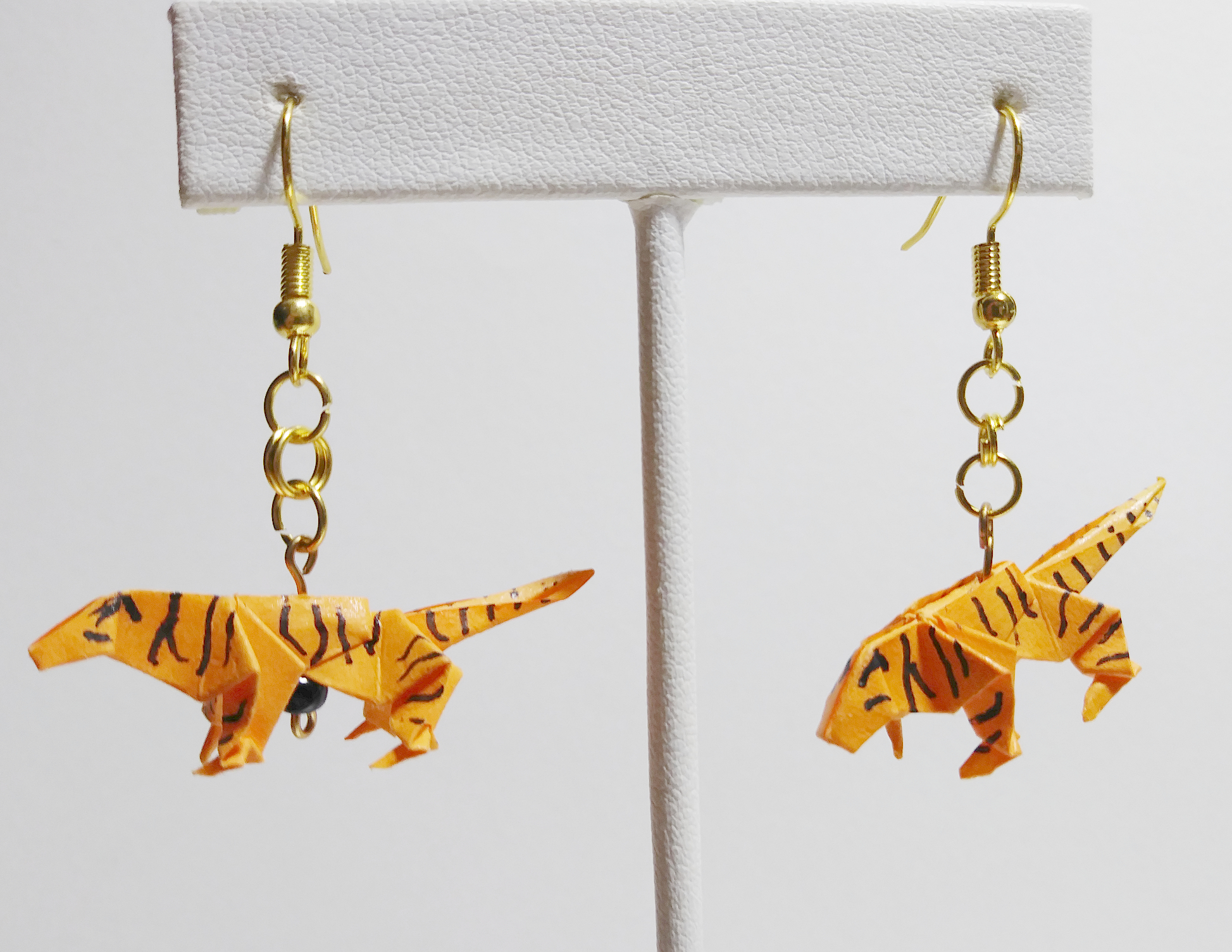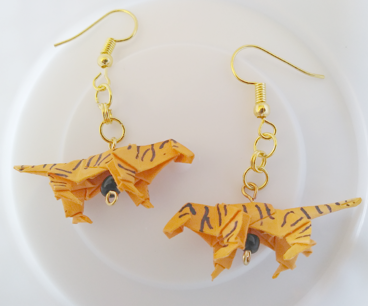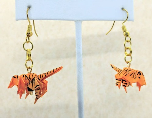 Origami Tigers earrings. Hand-folded and treated with a sealant or varnish to make them more durable and water resistant.