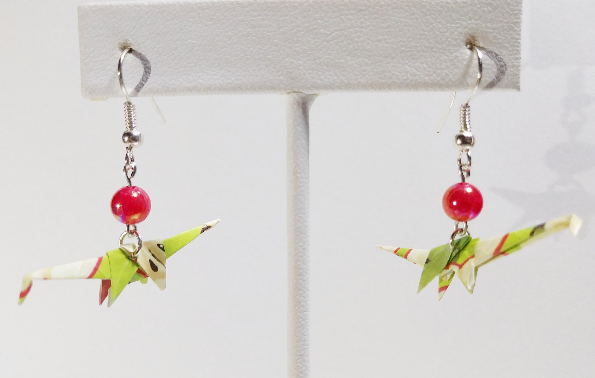 Origami Long Necked Dino earrings. Hand-folded and treated with a sealant or varnish to make them more durable and water resistant.