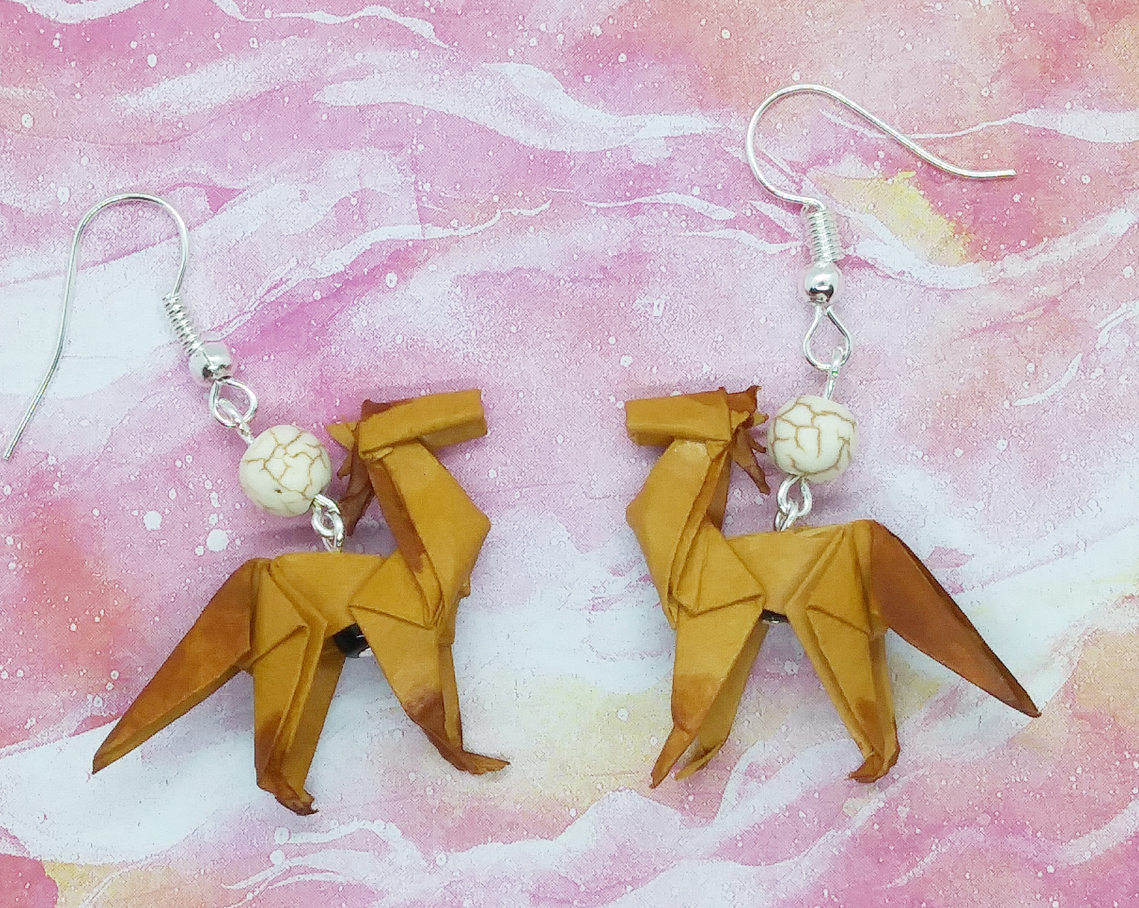Origami Horse earrings. Hand-folded and treated with a sealant or varnish to make them more durable and water resistant.