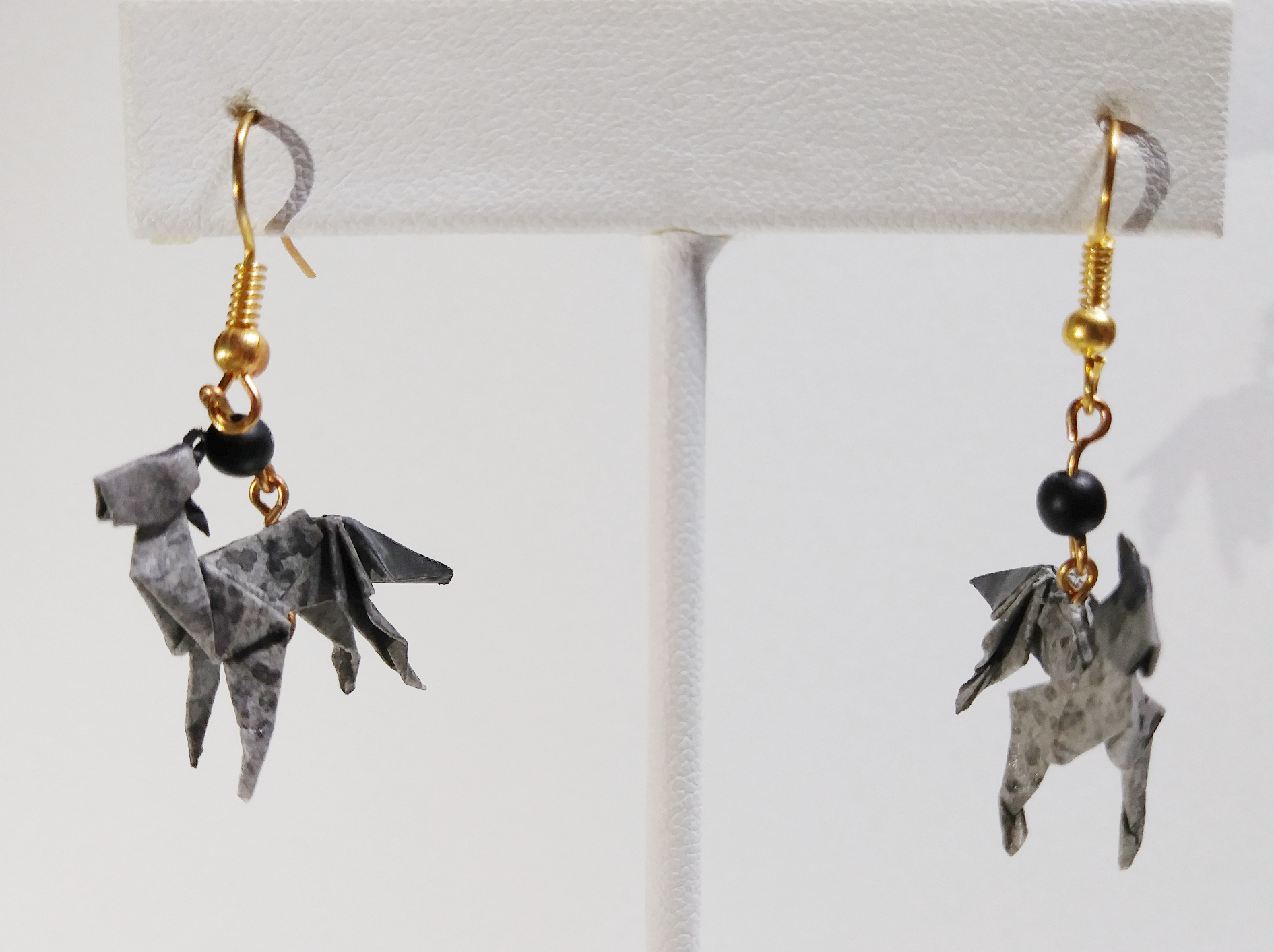Origami Horse earrings. Hand-folded and treated with a sealant or varnish to make them more durable and water resistant.