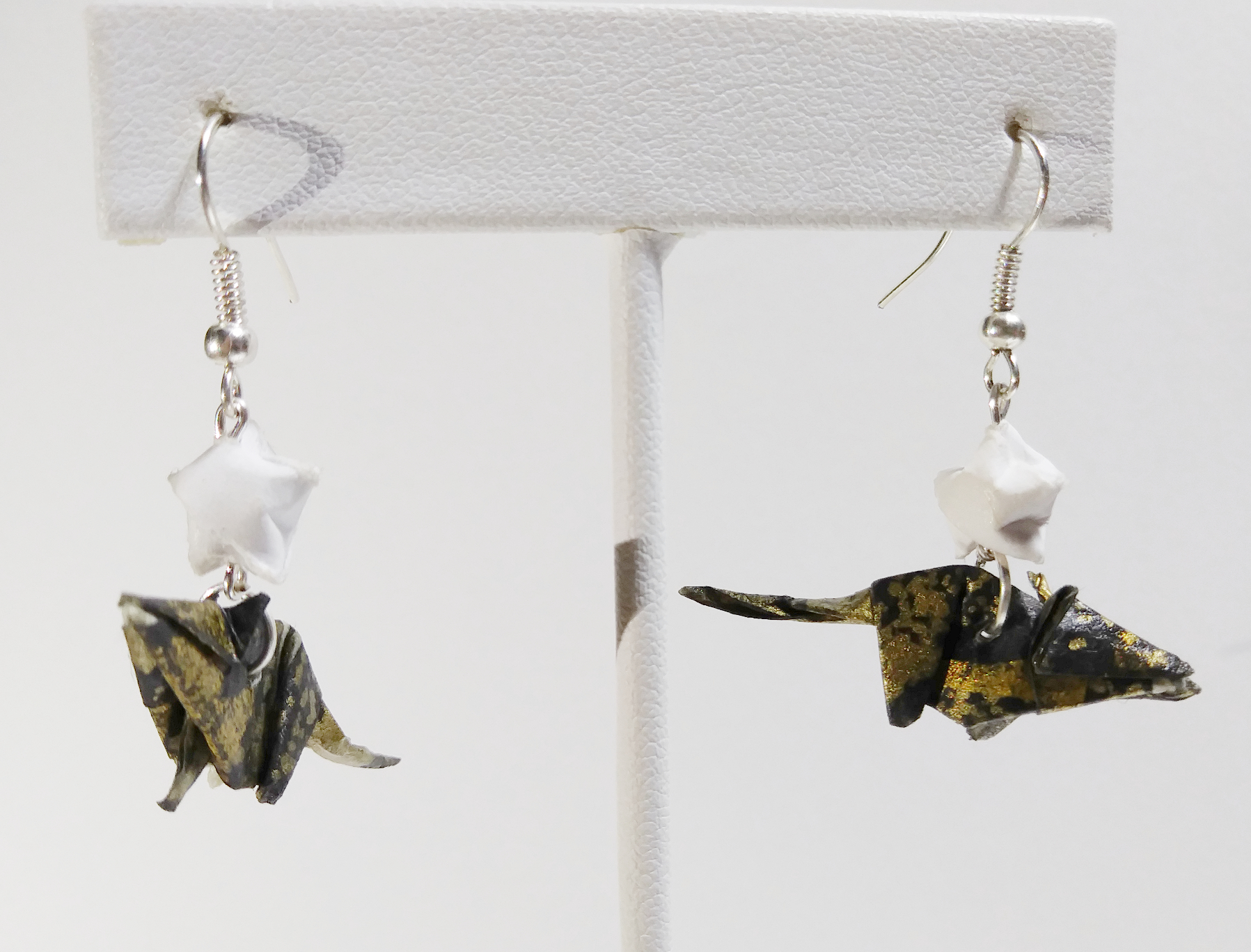 Origami Mouse earrings. Hand-folded and treated with a sealant or varnish to make them more durable and water resistant.