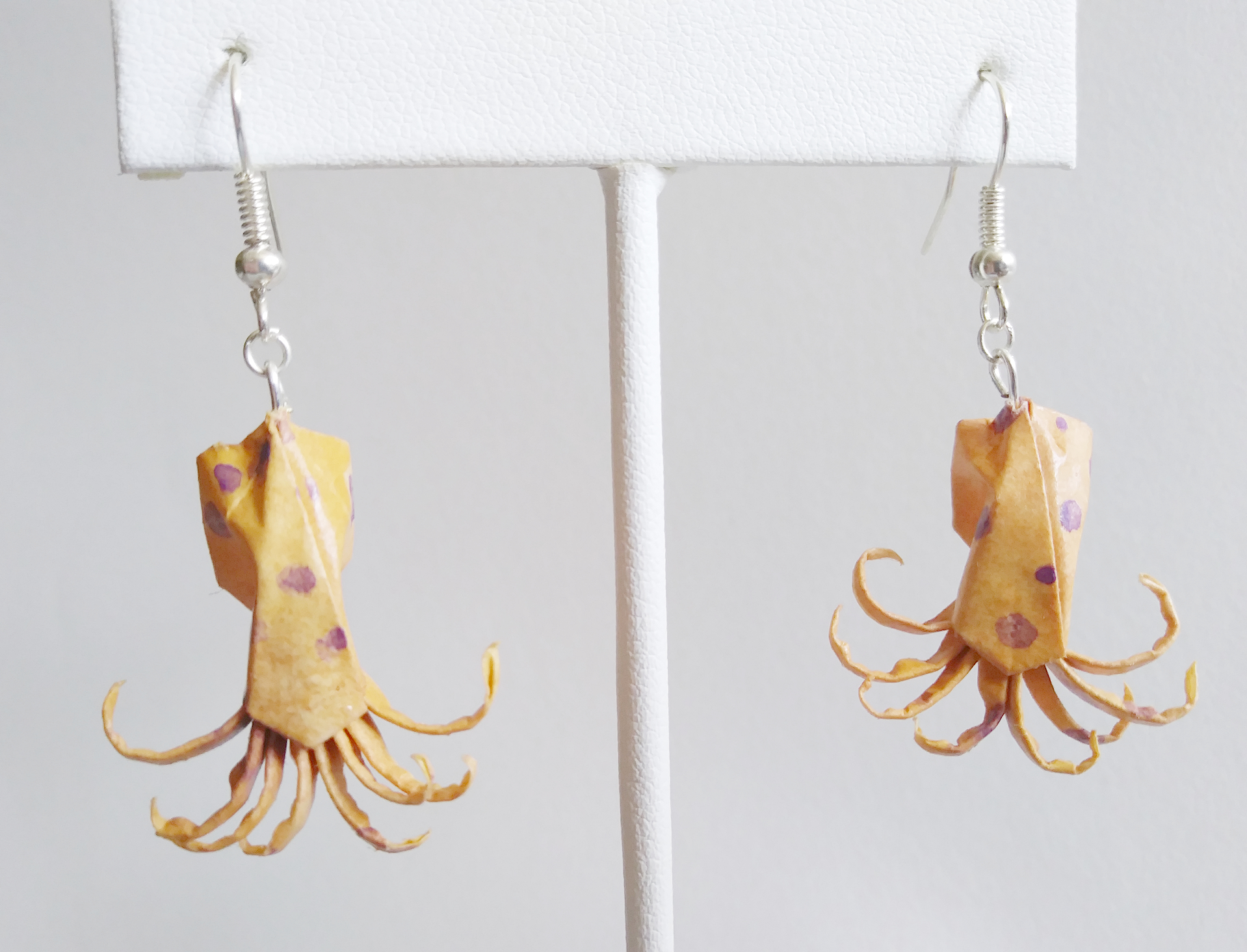 Origami Octopus earrings. Hand-folded and treated with a sealant or varnish to make them more durable and water resistant.
