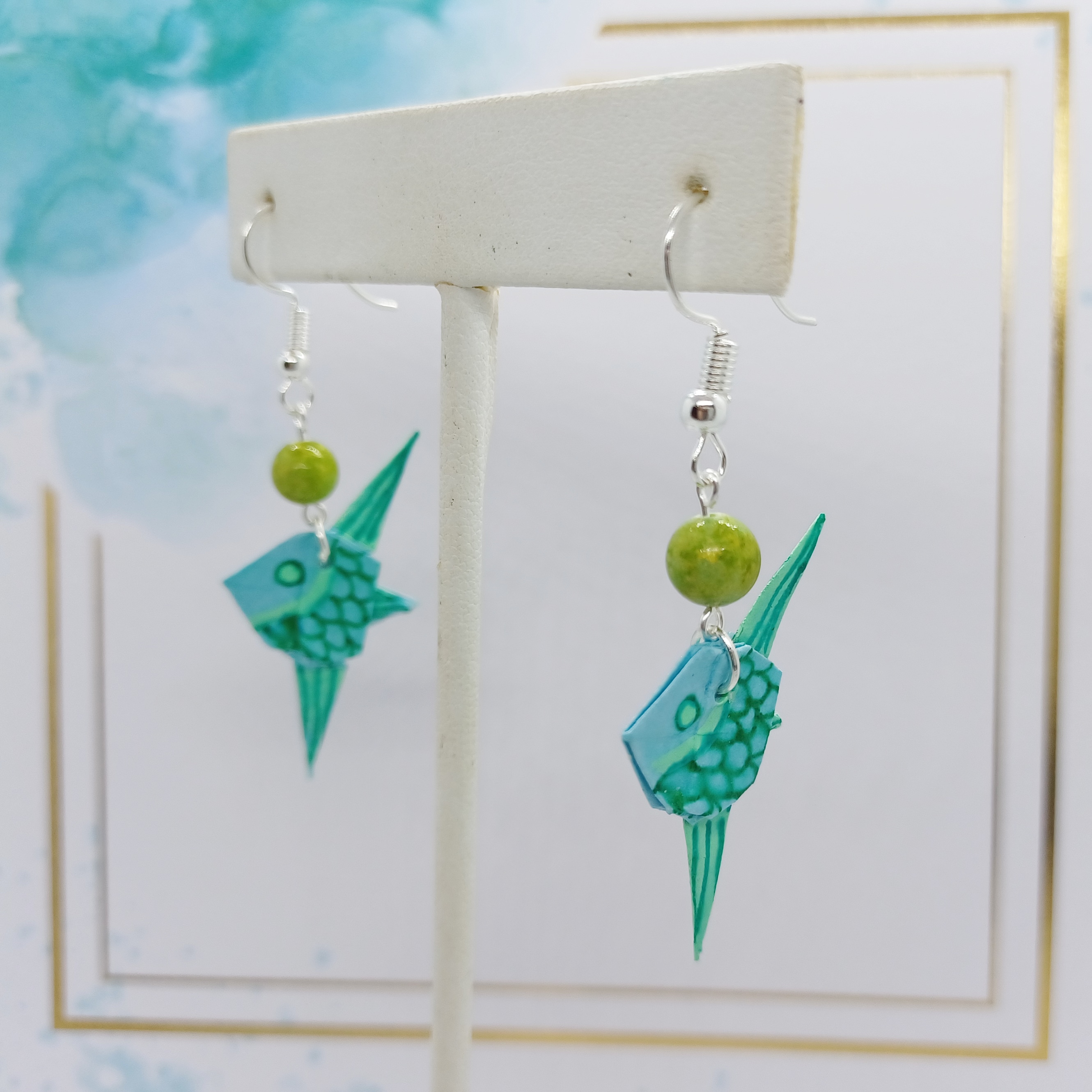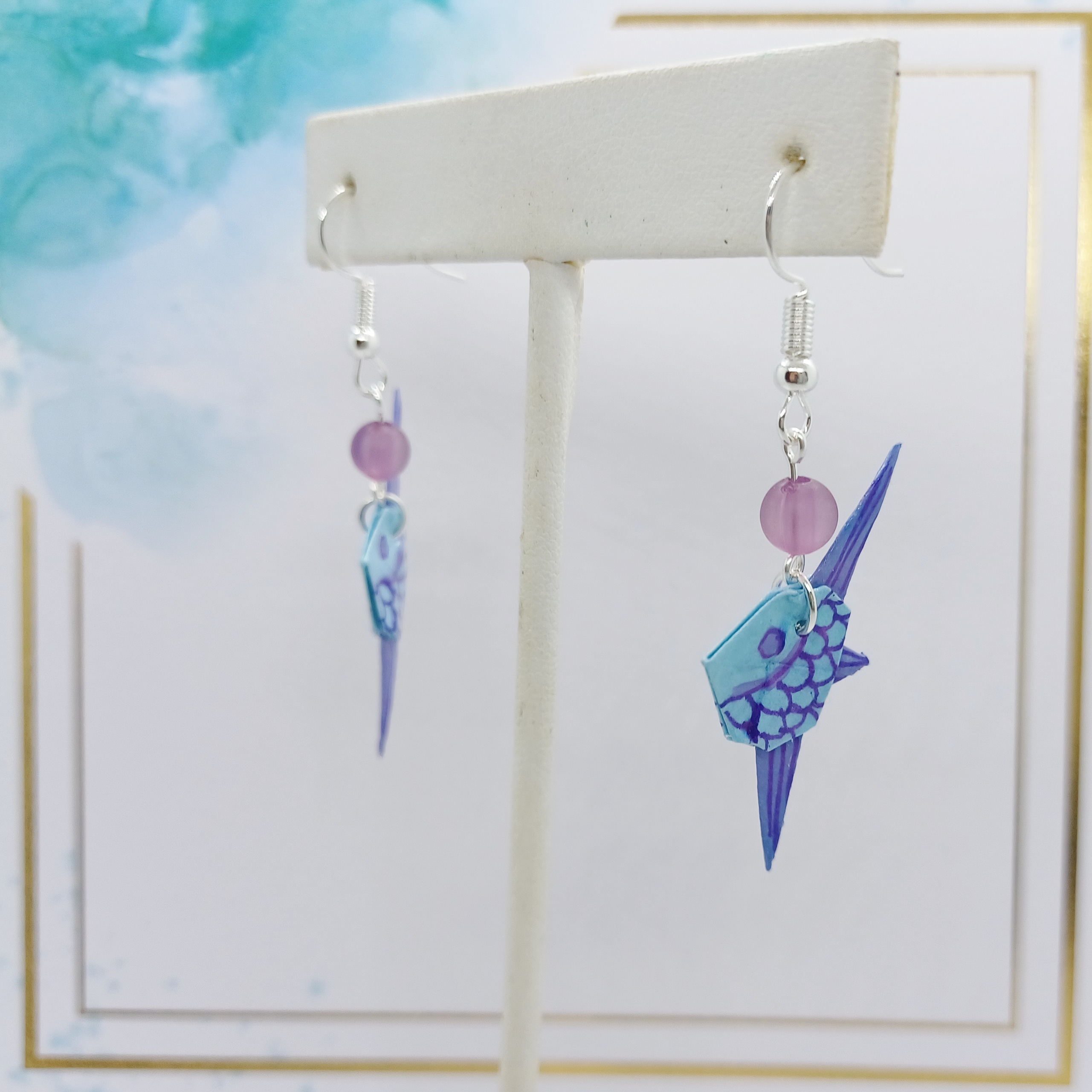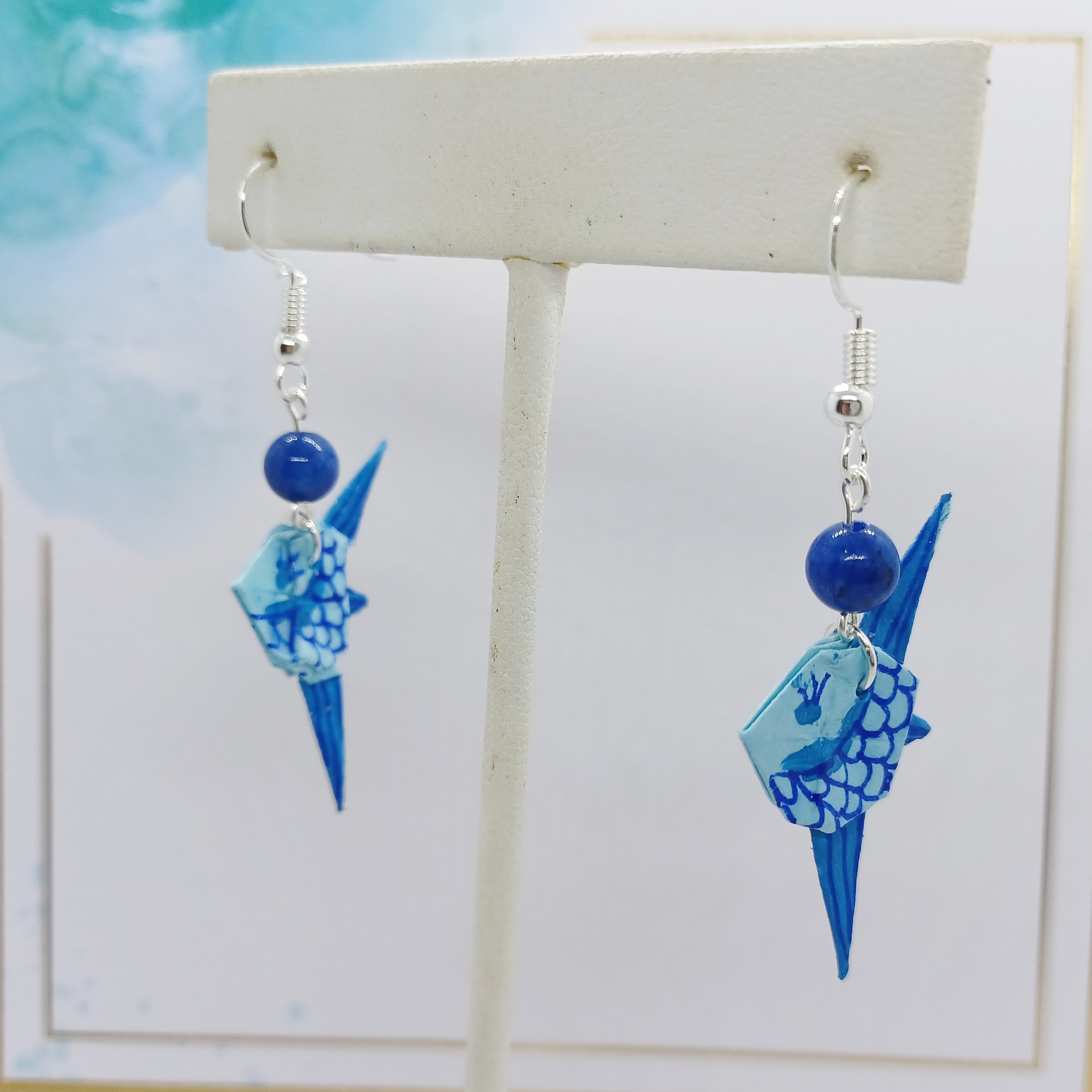 Origami Sunfish earrings. Hand-folded and treated with a sealant or varnish to make them more durable and water resistant.