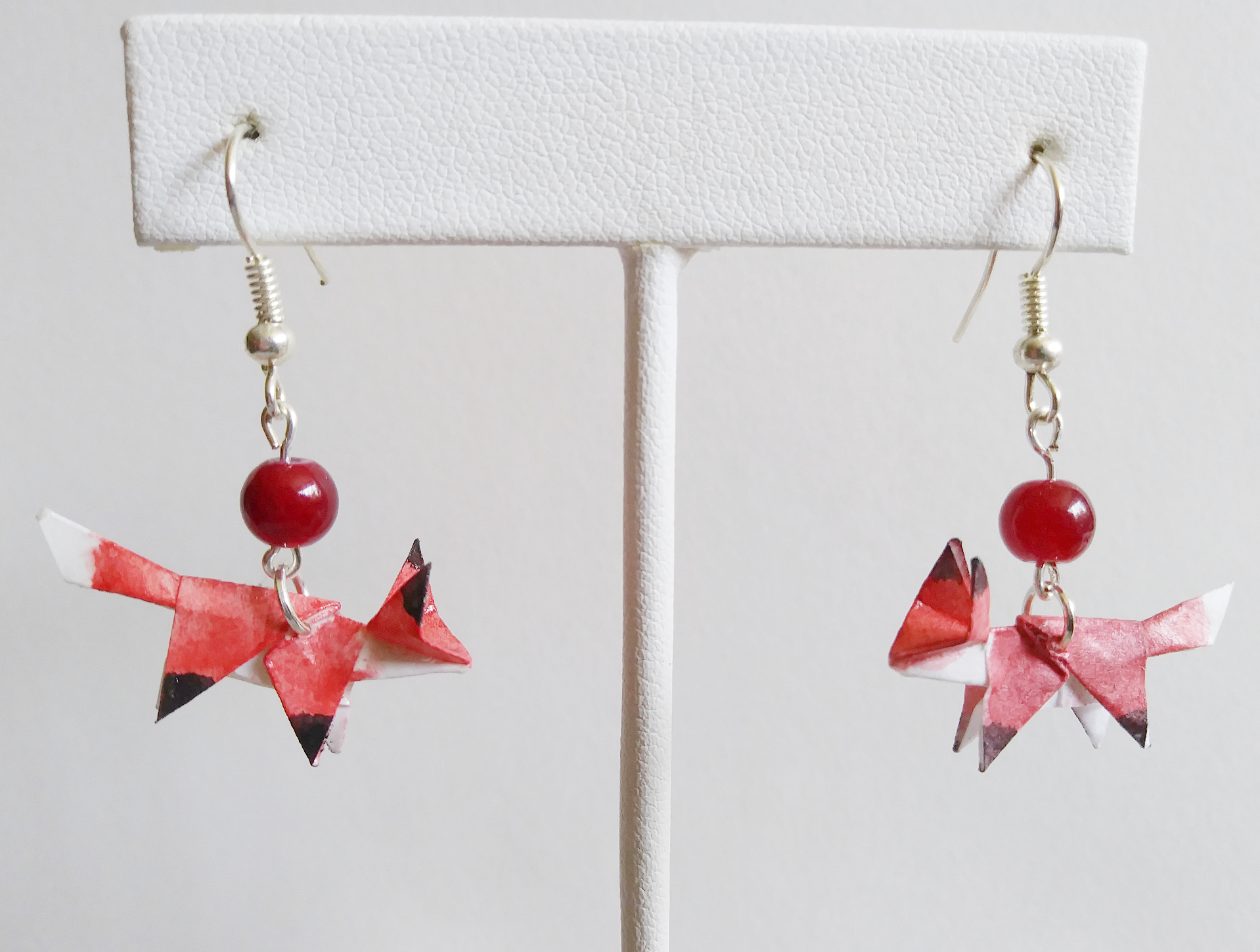 Origami Fox earrings. Hand-folded and treated with a sealant or varnish to make them more durable and water resistant.