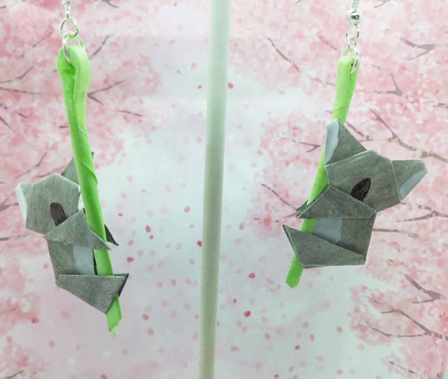 Origami Koalas! Handmade from paper and treated with a sealant to make them more durable and water resistant. Lead and nickle free. Each pair is handmade and unique.