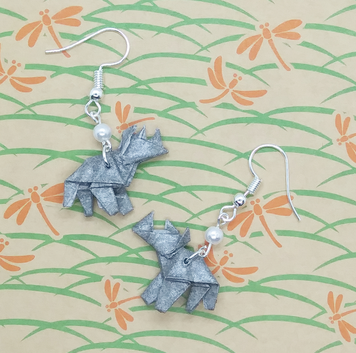 Origami Rhino earrings. Hand-folded and treated with a sealant or varnish to make them more durable and water resistant.