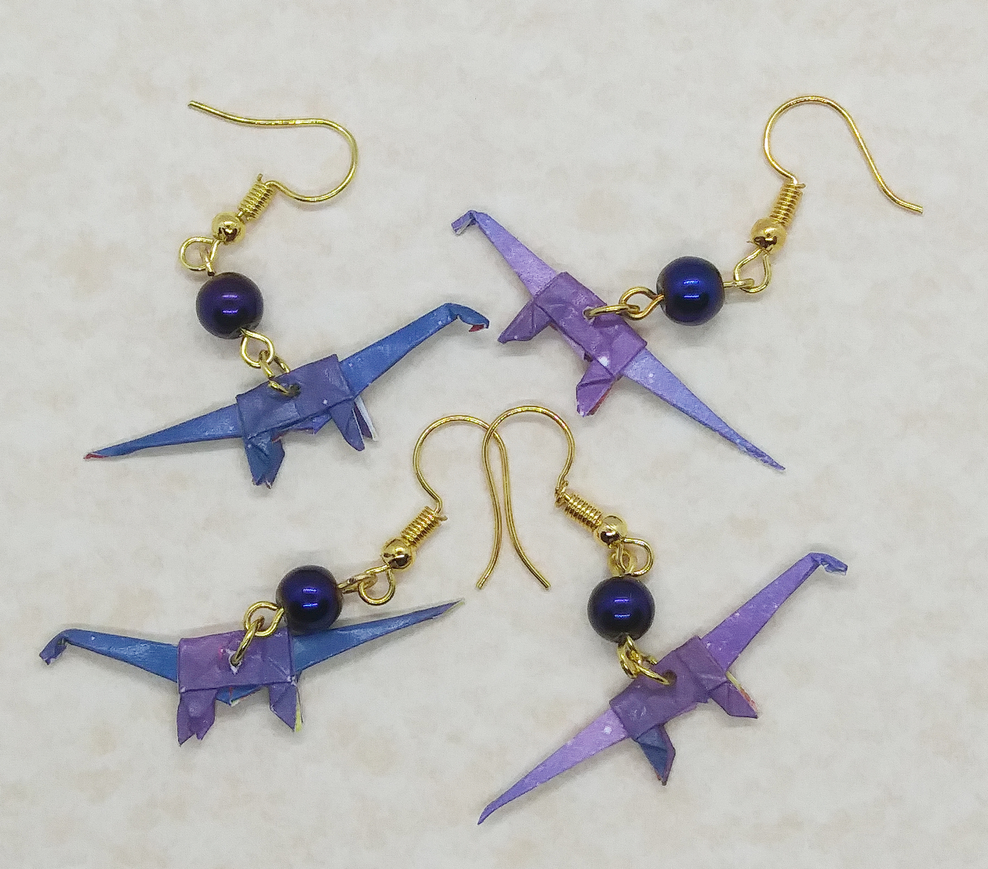 Origami Long Neck Dino earrings. Hand-folded and treated with a sealant or varnish to make them more durable and water resistant.
