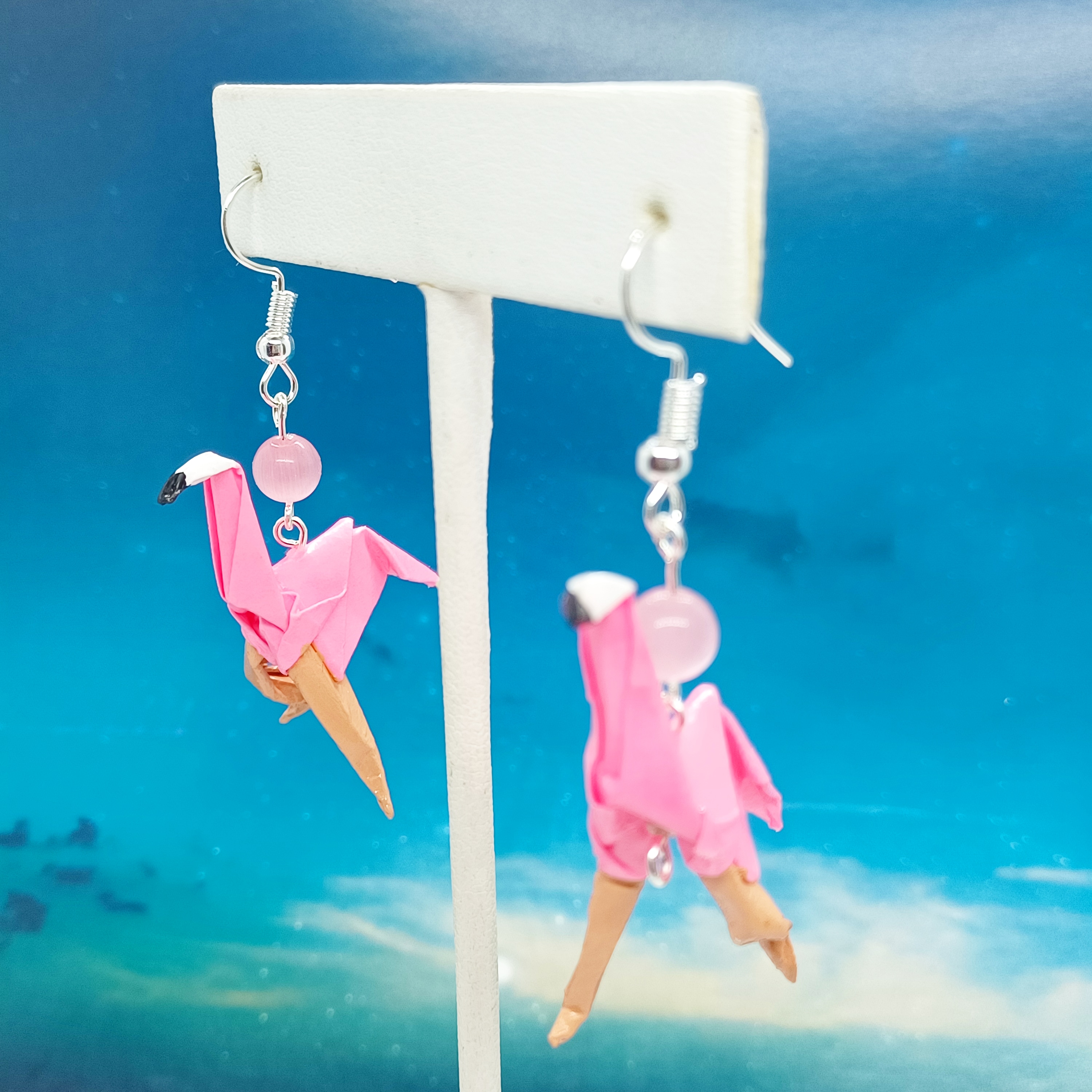Origami Flamingo earrings. Hand-folded and treated with a sealant or varnish to make them more durable and water resistant.