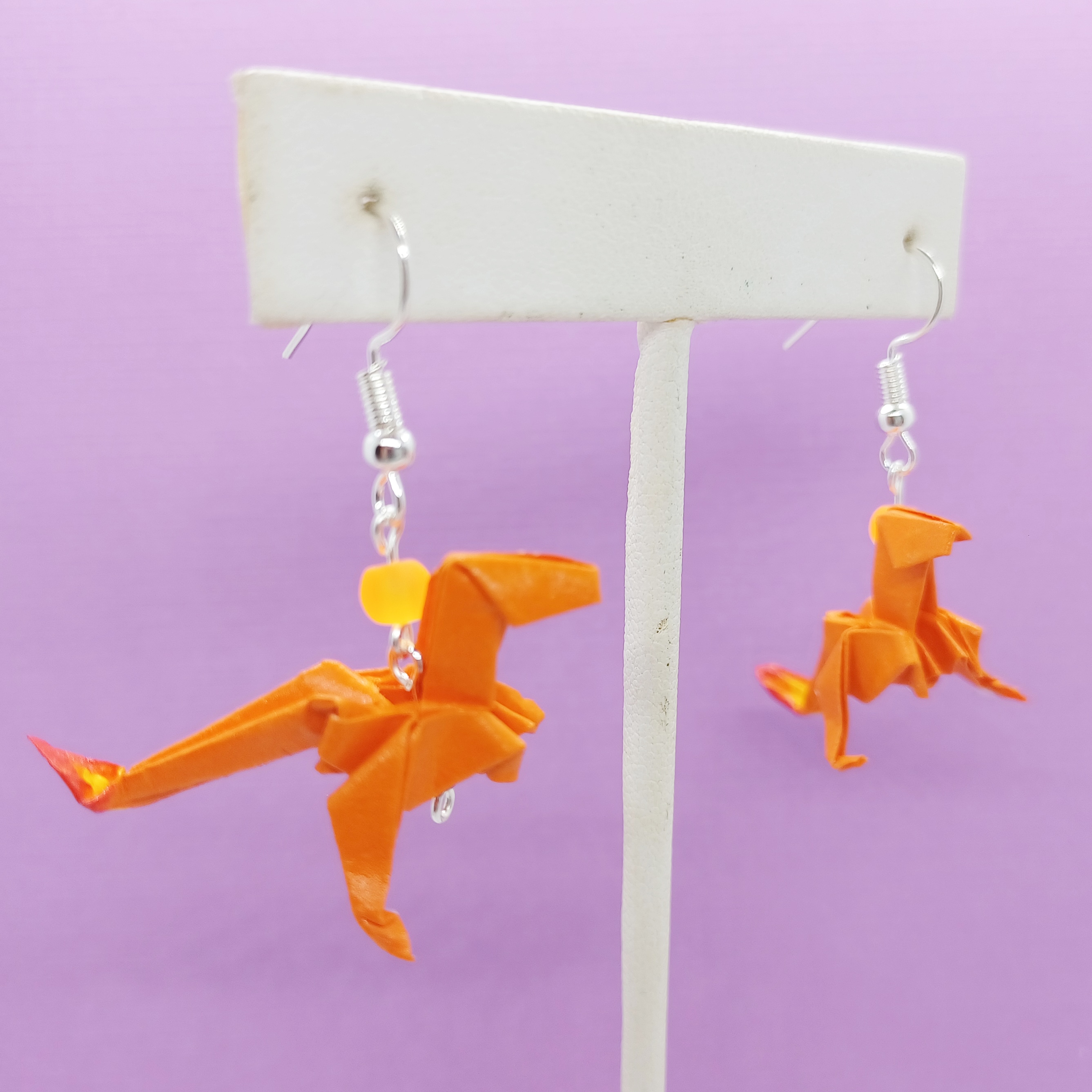 Origami Charmander earrings. Hand-folded and treated with a sealant or varnish to make them more durable and water resistant.