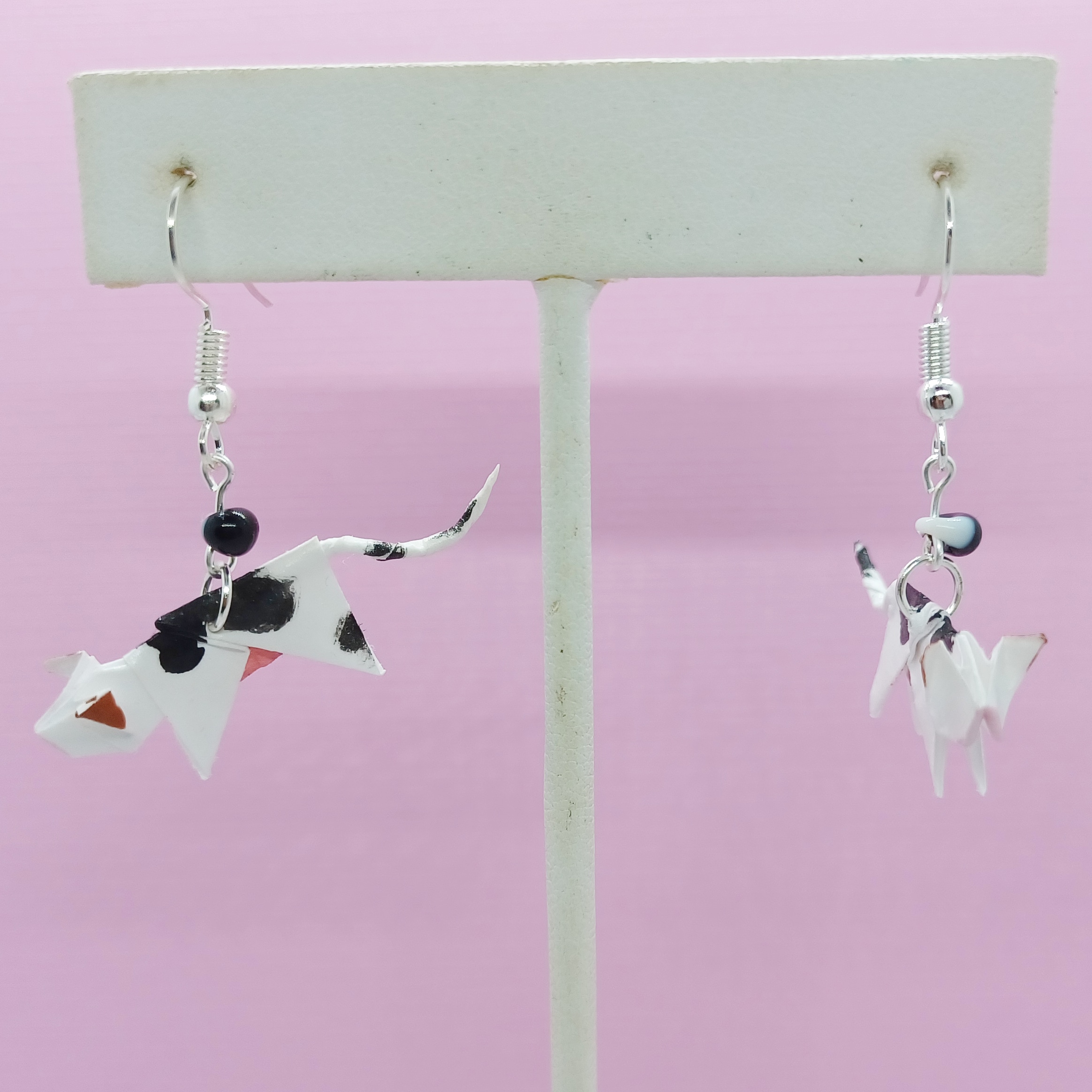 Origami Cow earrings. Made from paper and treated with a varnish to make them durable and water resistant. Lead and nickel free. Since they're all individually hand painted, there may be some differences from the photo.