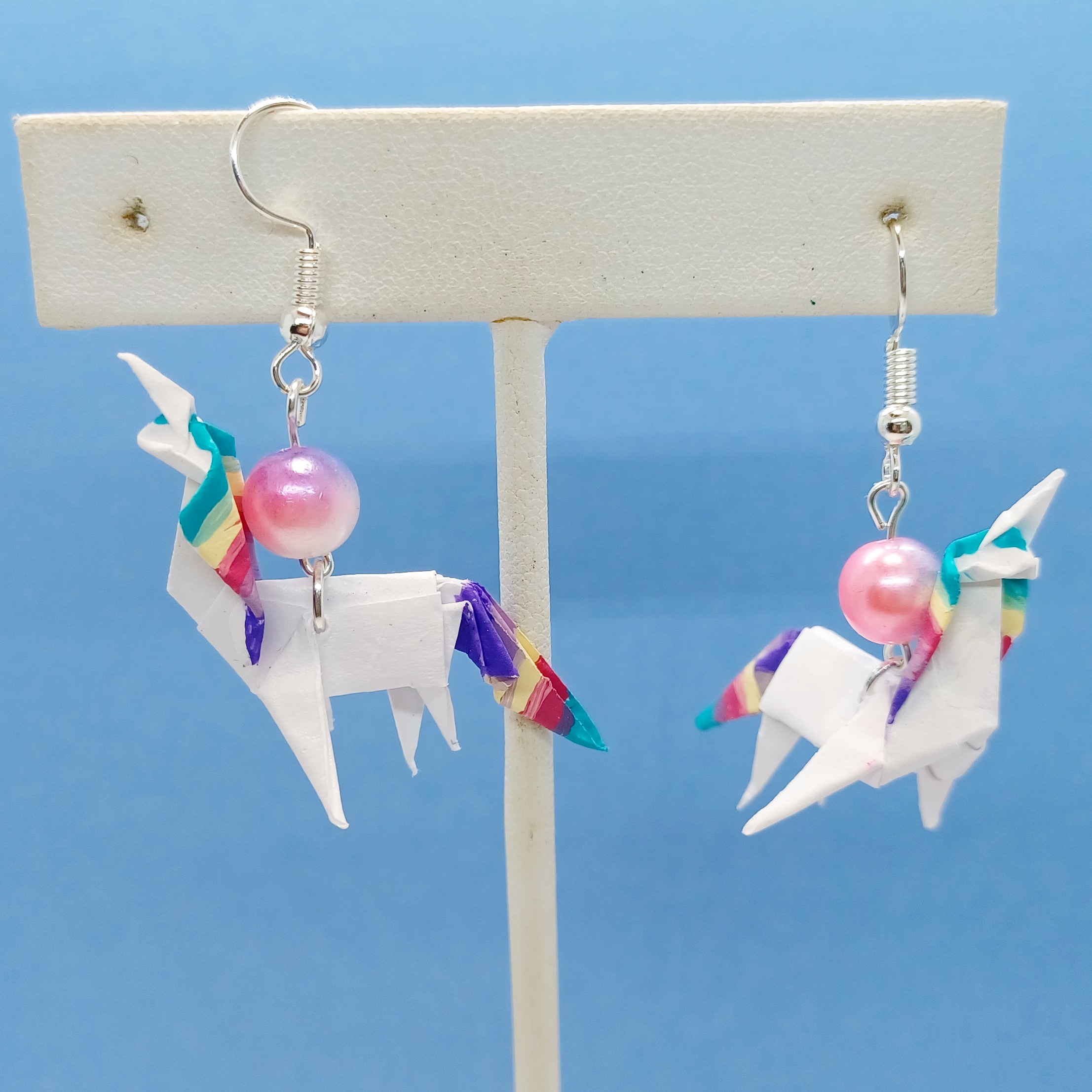 Origami Unicorn earrings. Hand-folded and treated with a sealant or varnish to make them more durable and water resistant.