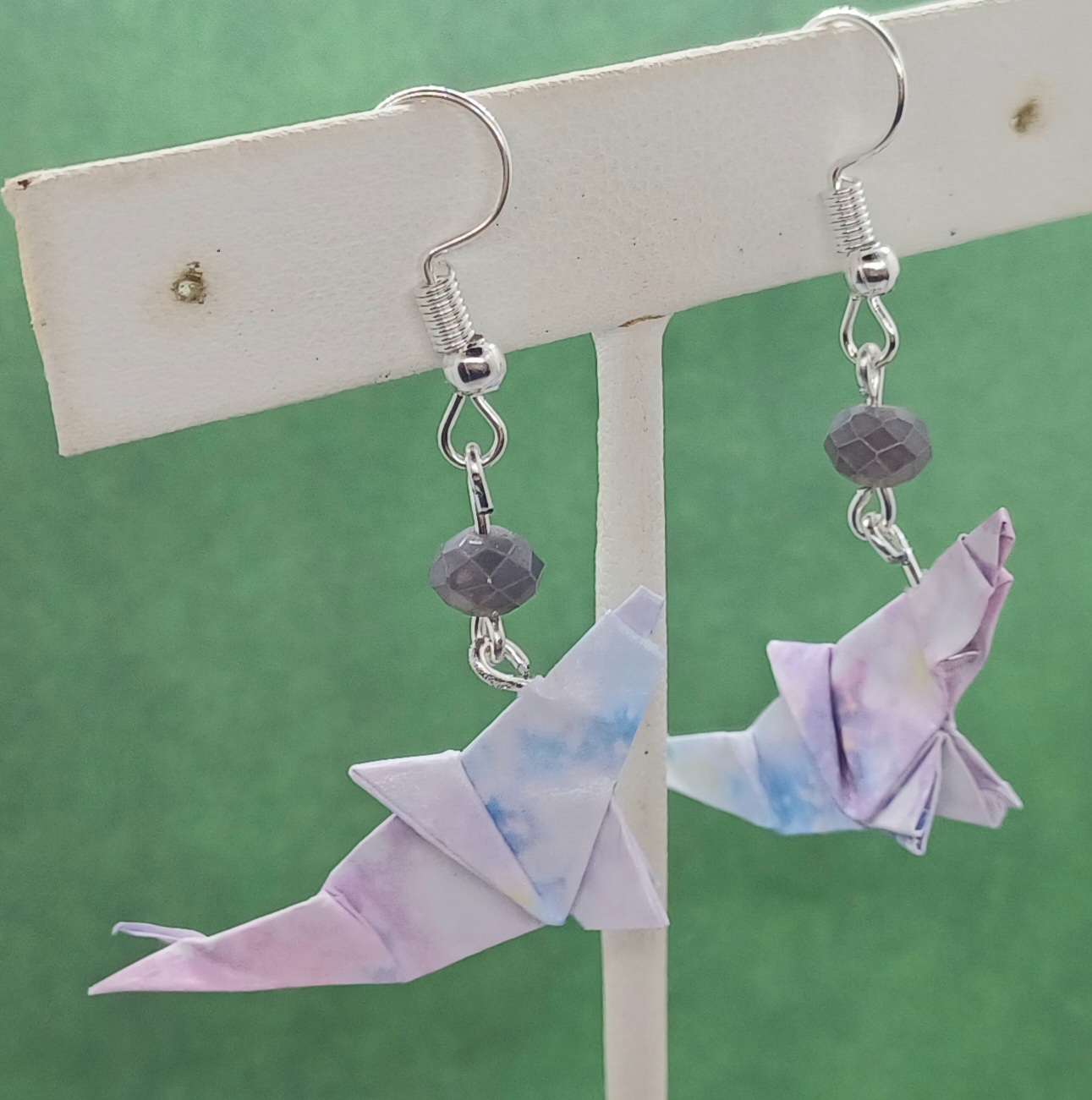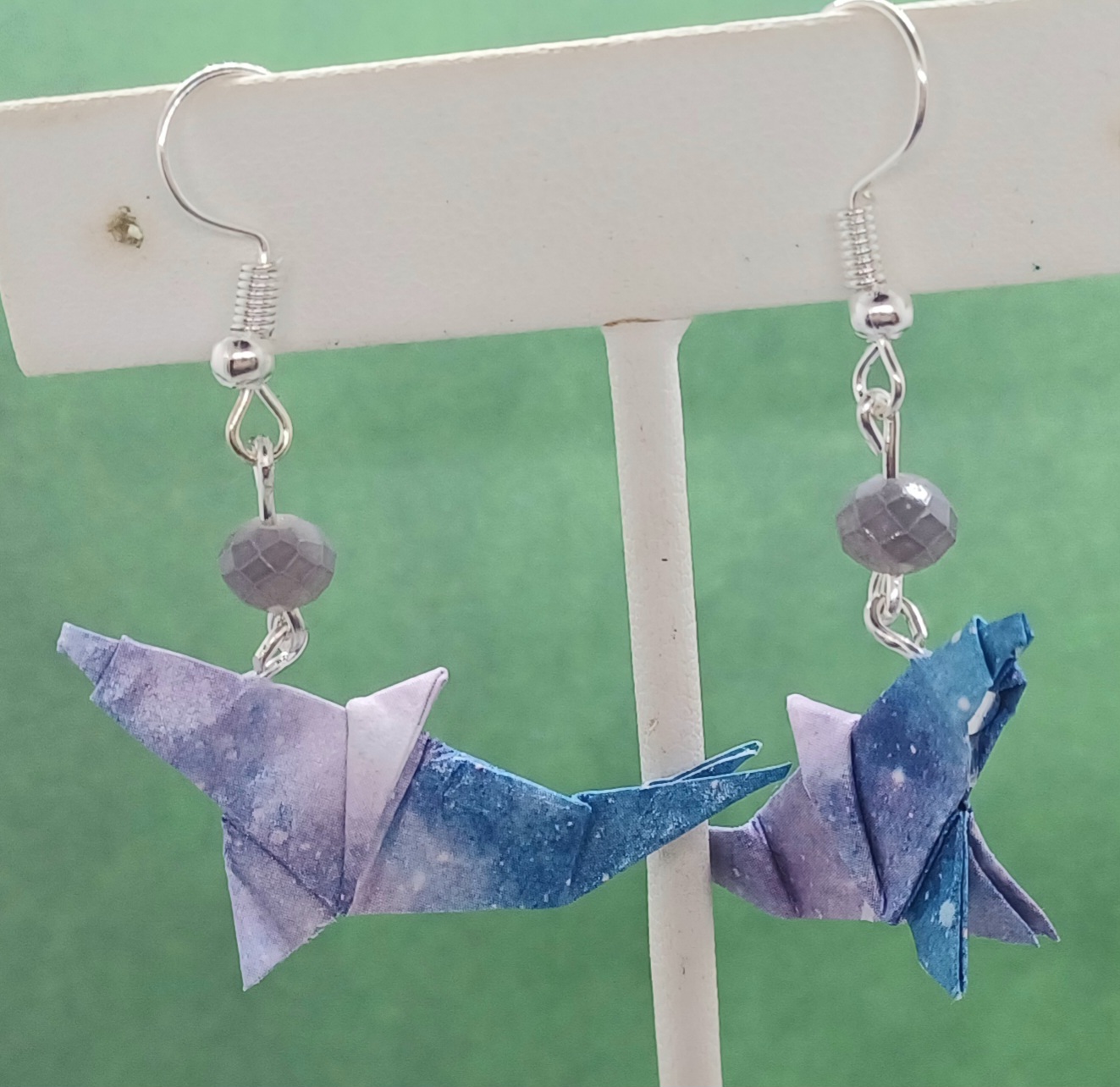 Origami dolphin earrings. Folded from real paper and treated with a varnish to make them water resistant.